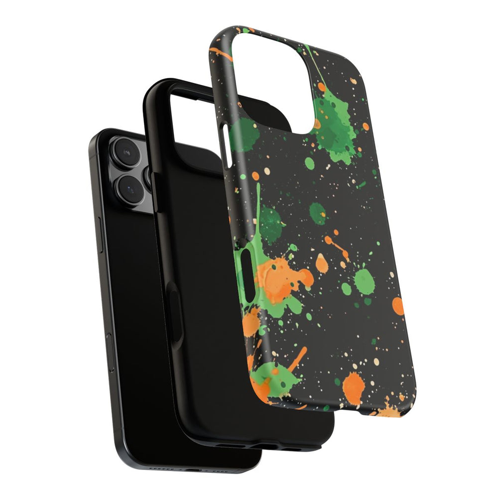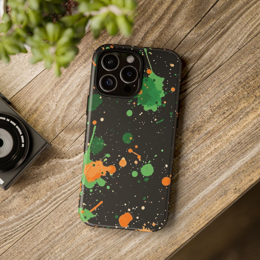 Dit telefoonhoesje is voorzien van een levendig patroon van groene en oranje verfspatten op een diepzwarte achtergrond. De spatten verschillen in grootte en vorm, wat zorgt voor een energieke en abstracte uitstraling. Het hoesje bestaat uit twee lagen: een stevige buitenkant van polycarbonaat en een flexibele binnenkant van TPU voor extra bescherming en duurzaamheid. Het hoesje ondersteunt draadloos opladen en is bestand tegen invloeden van buitenaf, zodat de uitstraling langdurig behouden blijft.