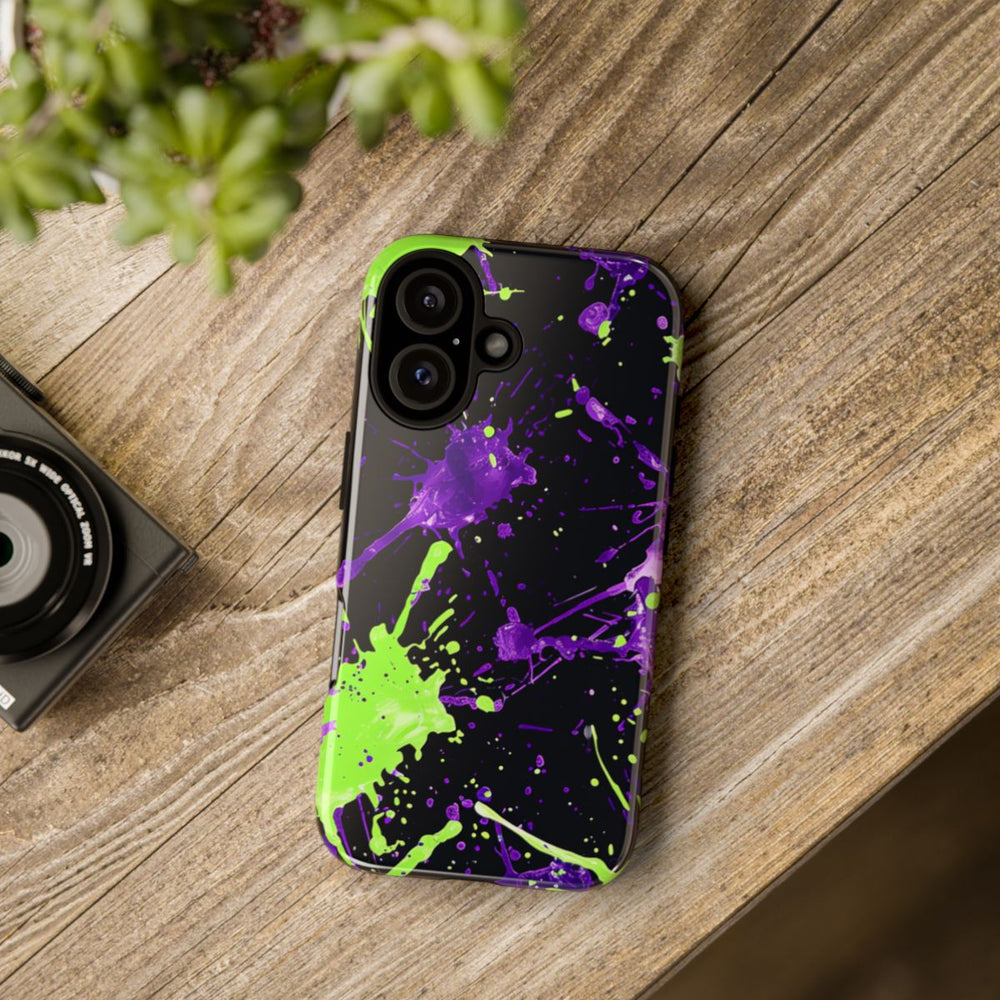 Dit hoesje heeft een opvallend ontwerp met levendige groene en paarse verfspatten op een diepzwarte achtergrond. De spatten verschillen in grootte en vorm, waardoor een dynamisch en energiek abstract patroon ontstaat. Het glanzende, stevige hoesje bestaat uit twee lagen: een buitenkant van polycarbonaat en een binnenzijde van TPU voor extra stevigheid en bescherming. Het hoesje ondersteunt draadloos opladen en is uitstekend bestand tegen weersinvloeden, terwijl het zijn heldere uitstraling langdurig behoudt.