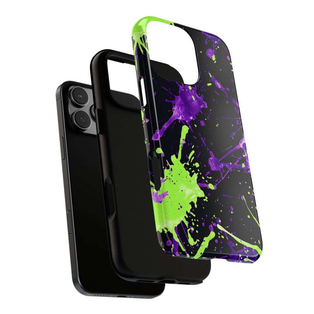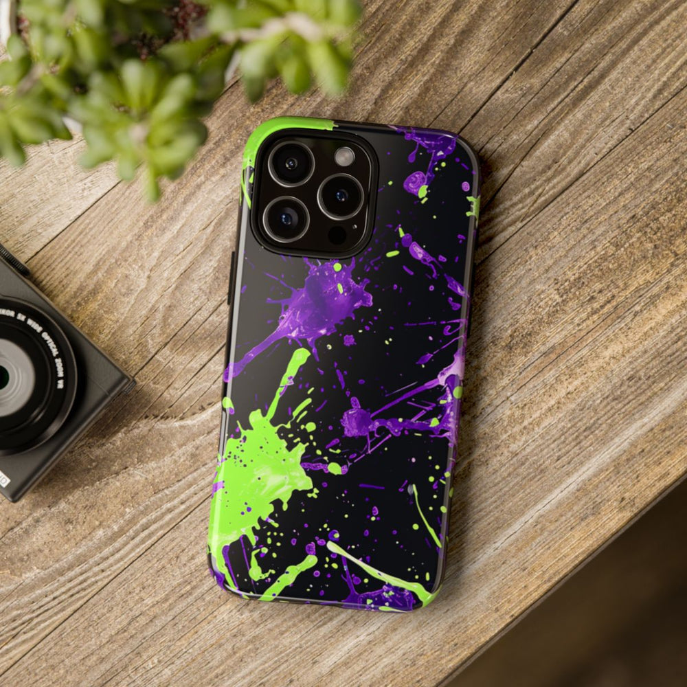 Dit hoesje heeft een opvallend ontwerp met levendige groene en paarse verfspatten op een diepzwarte achtergrond. De spatten verschillen in grootte en vorm, waardoor een dynamisch en energiek abstract patroon ontstaat. Het glanzende, stevige hoesje bestaat uit twee lagen: een buitenkant van polycarbonaat en een binnenzijde van TPU voor extra stevigheid en bescherming. Het hoesje ondersteunt draadloos opladen en is uitstekend bestand tegen weersinvloeden, terwijl het zijn heldere uitstraling langdurig behoudt.