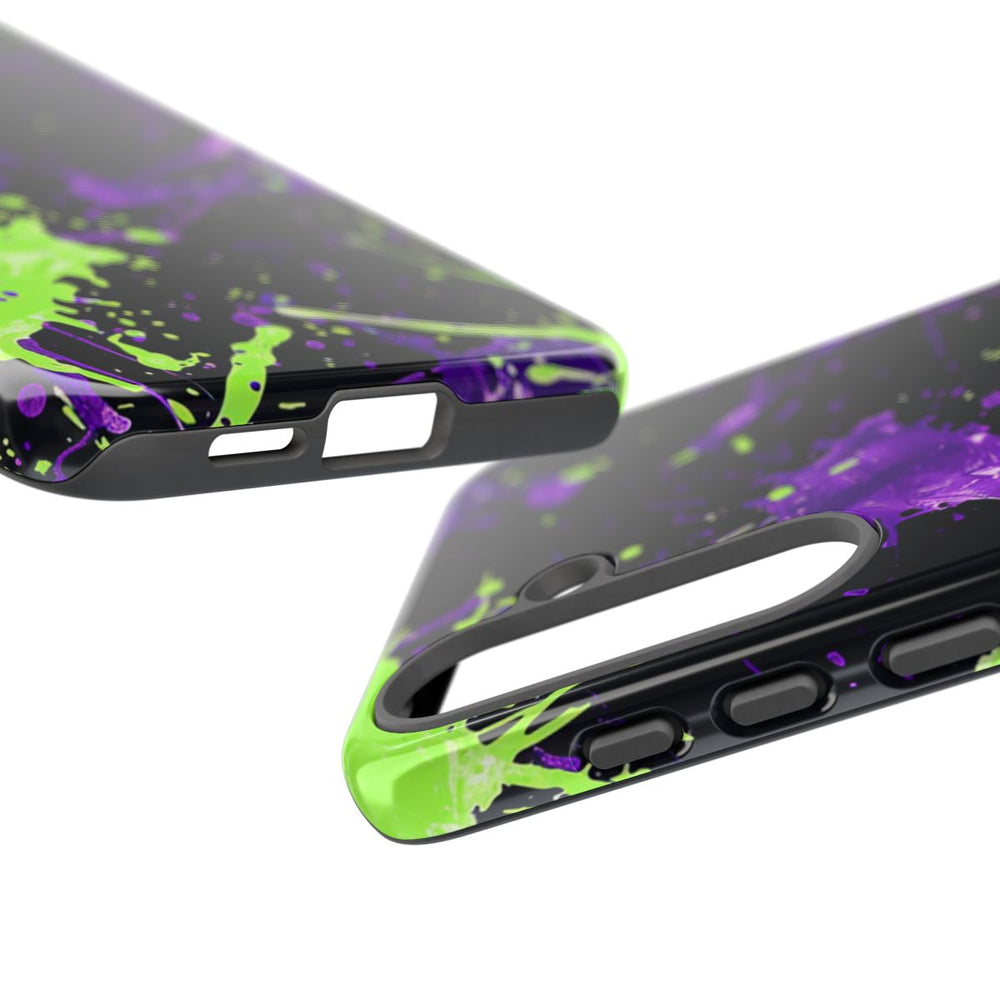 Dit hoesje heeft een opvallend ontwerp met levendige groene en paarse verfspatten op een diepzwarte achtergrond. De spatten verschillen in grootte en vorm, waardoor een dynamisch en energiek abstract patroon ontstaat. Het glanzende, stevige hoesje bestaat uit twee lagen: een buitenkant van polycarbonaat en een binnenzijde van TPU voor extra stevigheid en bescherming. Het hoesje ondersteunt draadloos opladen en is uitstekend bestand tegen weersinvloeden, terwijl het zijn heldere uitstraling langdurig behoudt.