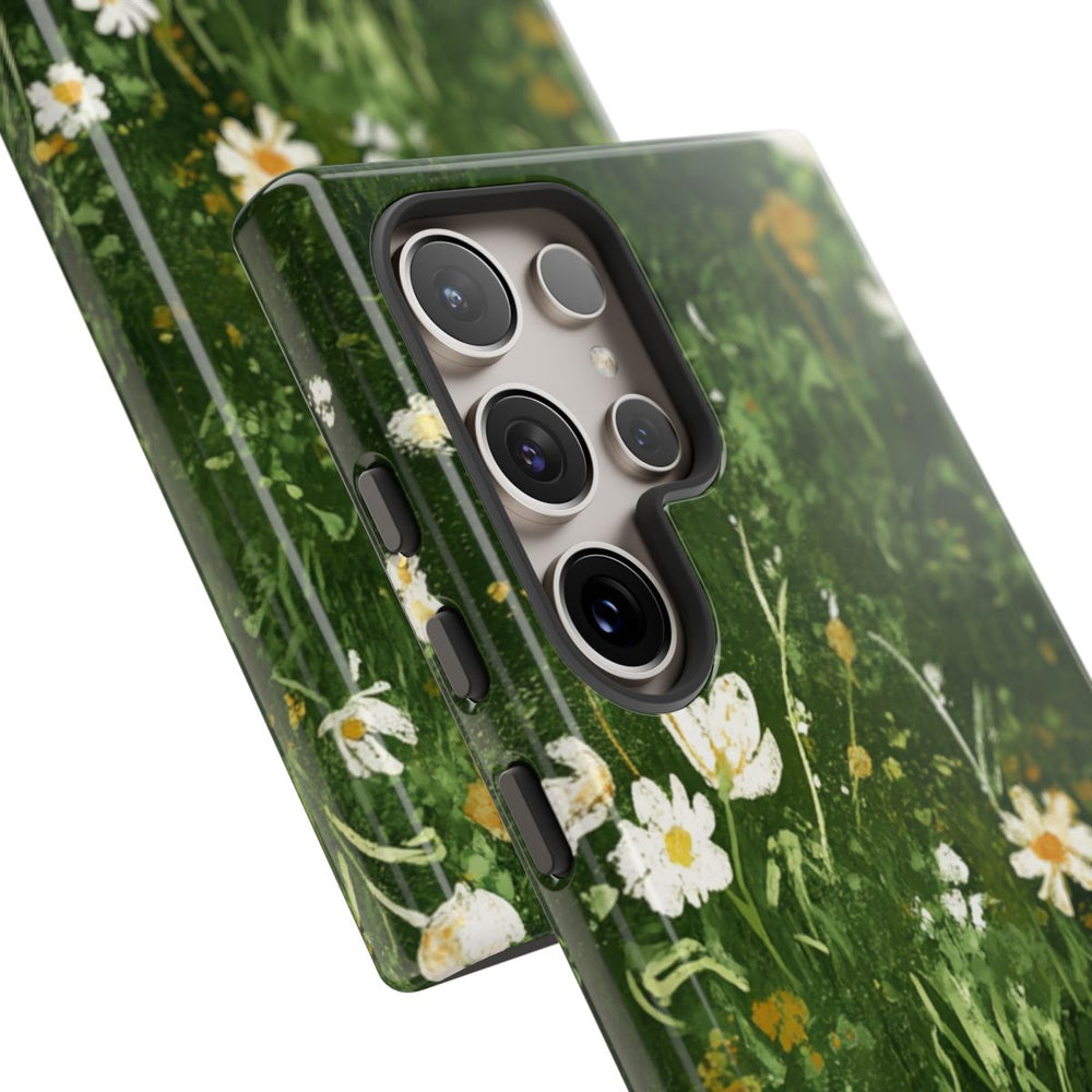 Dit hoesje heeft een ontwerp van een weelderige groene weide met sierlijke witte bloemen die verspreid over het gras staan. De achtergrond bestaat uit verschillende groentinten, wat zorgt voor een levendig en natuurlijk effect. Kleine gele en oranje accenten tussen de bloemen geven het geheel subtiele kleurnuances. Het resultaat is een rustgevend en kleurrijk patroon geïnspireerd op de natuur. Het hoesje heeft een glanzende afwerking en is vervaardigd met een stevige polycarbonaat buitenkant en een TPU binnenzijde, voor optimale bescherming en geschikt voor draadloos opladen.