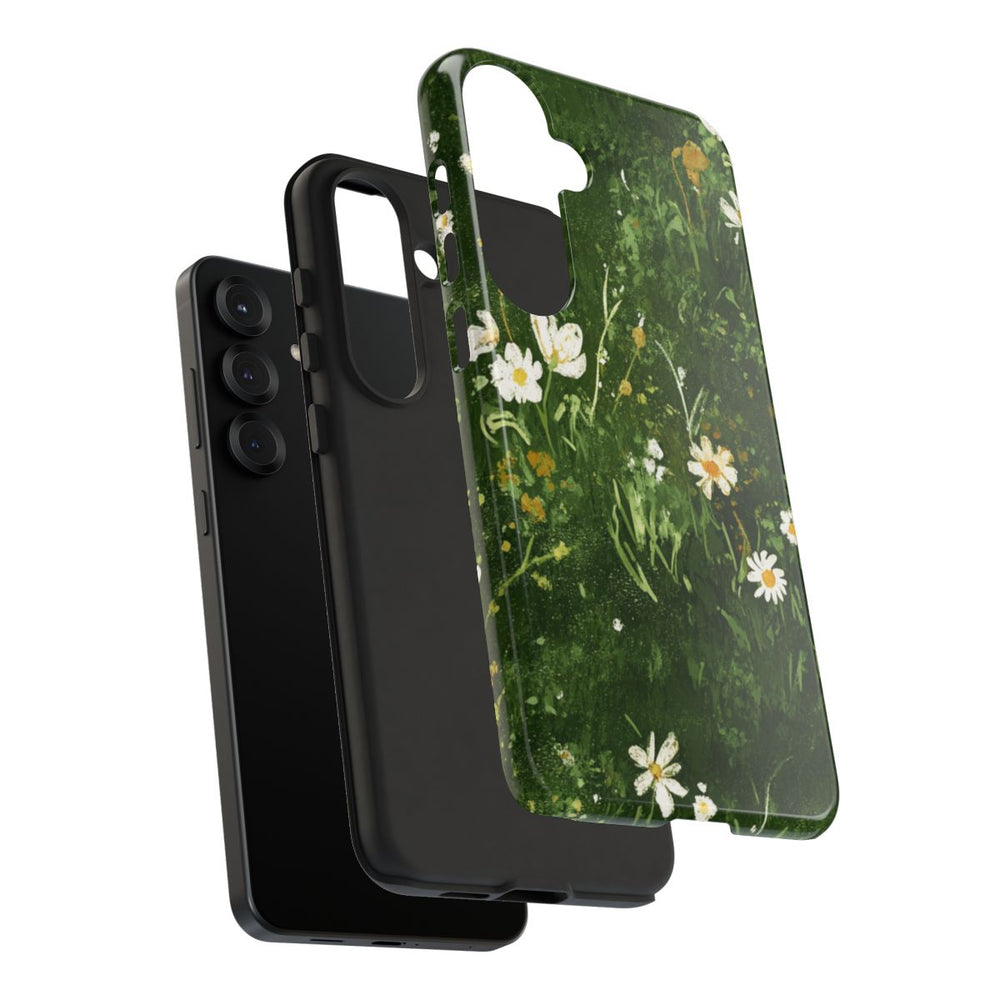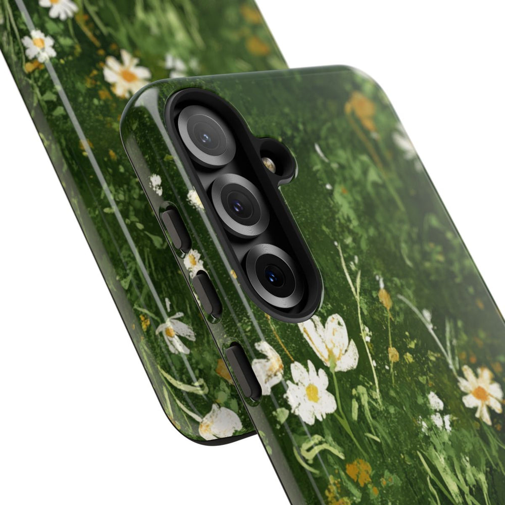 Dit hoesje heeft een ontwerp van een weelderige groene weide met sierlijke witte bloemen die verspreid over het gras staan. De achtergrond bestaat uit verschillende groentinten, wat zorgt voor een levendig en natuurlijk effect. Kleine gele en oranje accenten tussen de bloemen geven het geheel subtiele kleurnuances. Het resultaat is een rustgevend en kleurrijk patroon geïnspireerd op de natuur. Het hoesje heeft een glanzende afwerking en is vervaardigd met een stevige polycarbonaat buitenkant en een TPU binnenzijde, voor optimale bescherming en geschikt voor draadloos opladen.