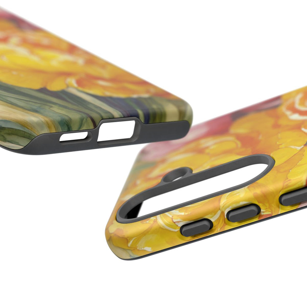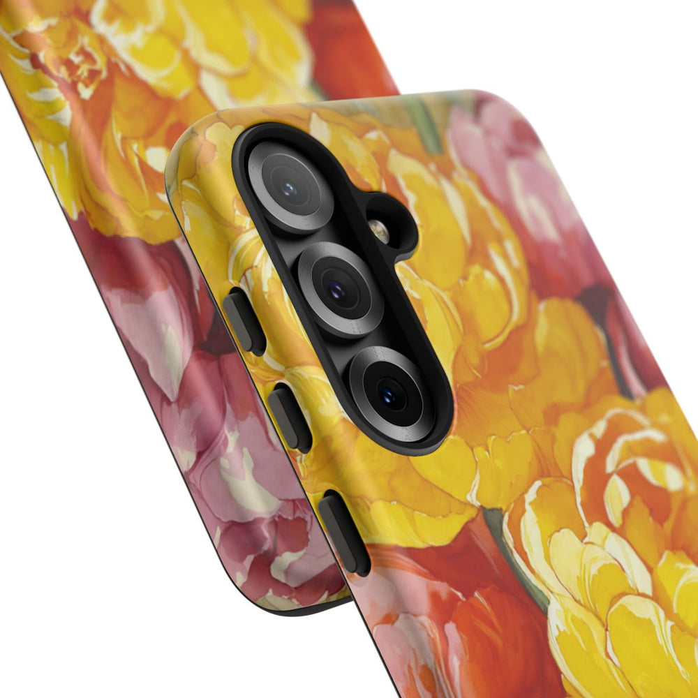 Dit hoesje is bedrukt met een gedetailleerde aquarel van grote bloemen in levendige gele, roze en oranje tinten. De bloembladeren zijn prachtig uitgewerkt met zachte schaduwen en lichte accenten, tegen een subtiele, golvende achtergrond met groene stelen en bladeren. Het stevige, matte hoesje bestaat uit twee lagen van polycarbonaat en TPU voor extra bescherming en is bestand tegen intensief gebruik, ook buitenshuis. Geschikt voor draadloos opladen.