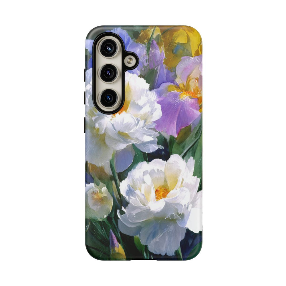Dit hoesje is versierd met grote witte pioenen en lila irissen, prachtig weergegeven in een levendige aquarelstijl. De achtergrond bevat abstracte goud- en groentinten die de bloemen extra laten opvallen. Het hoesje bestaat uit een dubbele laag van polycarbonaat en een TPU-voering voor optimale bescherming. Dankzij de ondersteuning voor draadloos opladen is dit hoesje niet alleen stijlvol, maar ook praktisch voor dagelijks gebruik.