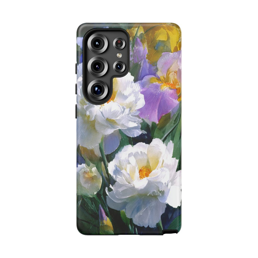 Dit hoesje heeft een ontwerp met grote witte pioenen en lila irissen, afgebeeld tegen een abstracte achtergrond met levendige kleuren. De aquarelstijl benadrukt de schoonheid van het bloemmotief. Het hoesje bestaat uit twee lagen voor extra stevigheid en bescherming, en ondersteunt draadloos opladen. Ideaal voor liefhebbers van de natuur en kleurrijke bloemenprints.