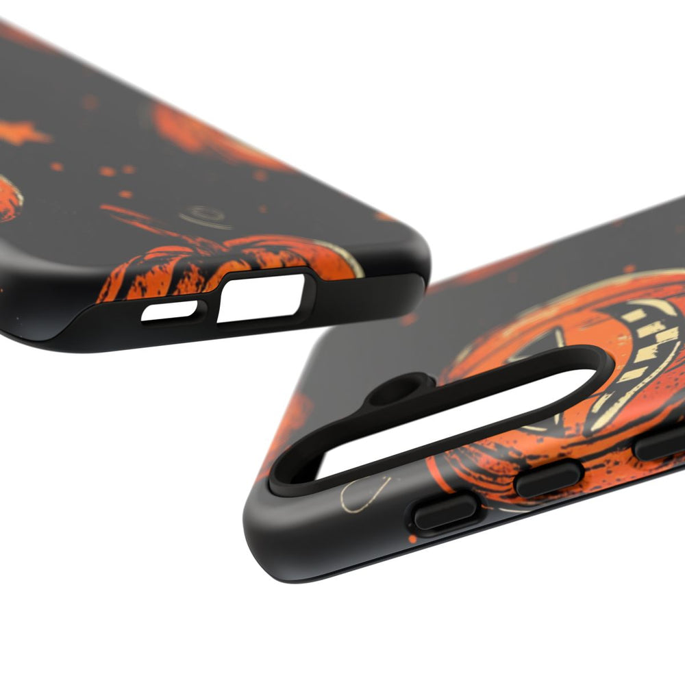 Dit hoesje heeft een speels en stoer ontwerp met een herhalend patroon van oranje pompoenen met uitgesneden gezichten, variërend van ondeugende tot vrolijke uitdrukkingen. De pompoenen zijn getekend in grunge-stijl met opvallende textuur en zwarte accenten. Kleine oranje sterretjes en stippen zijn verspreid over de effen zwarte achtergrond, wat zorgt voor een unieke Halloween-uitstraling. Het hoesje bestaat uit twee lagen (polycarbonaat en TPU) en is mat afgewerkt. Het biedt uitstekende bescherming, is bestand tegen weersinvloeden en ondersteunt draadloos opladen.