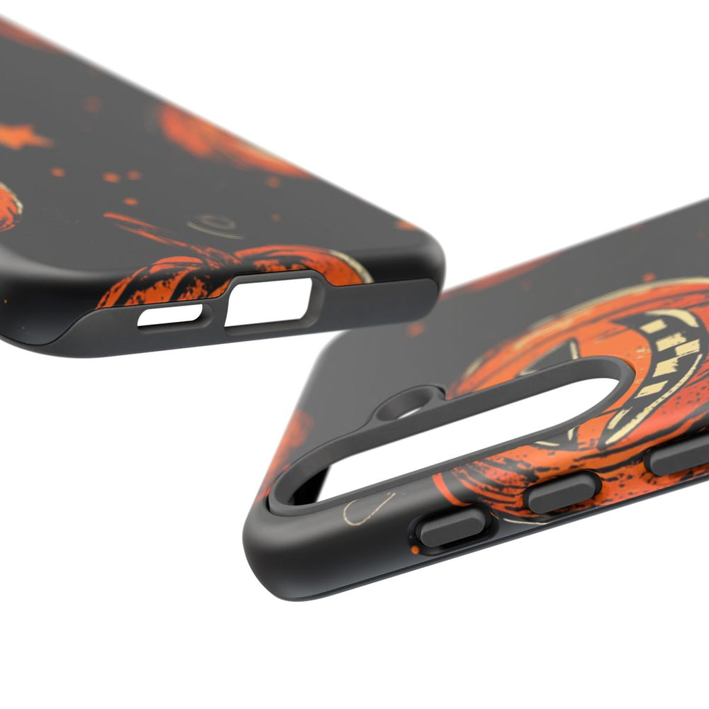 Dit hoesje heeft een speels en stoer ontwerp met een herhalend patroon van oranje pompoenen met uitgesneden gezichten, variërend van ondeugende tot vrolijke uitdrukkingen. De pompoenen zijn getekend in grunge-stijl met opvallende textuur en zwarte accenten. Kleine oranje sterretjes en stippen zijn verspreid over de effen zwarte achtergrond, wat zorgt voor een unieke Halloween-uitstraling. Het hoesje bestaat uit twee lagen (polycarbonaat en TPU) en is mat afgewerkt. Het biedt uitstekende bescherming, is bestand tegen weersinvloeden en ondersteunt draadloos opladen.