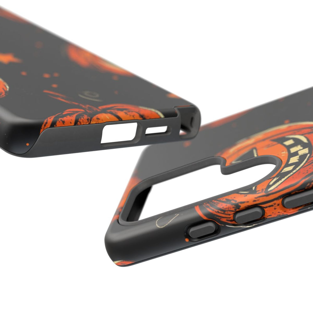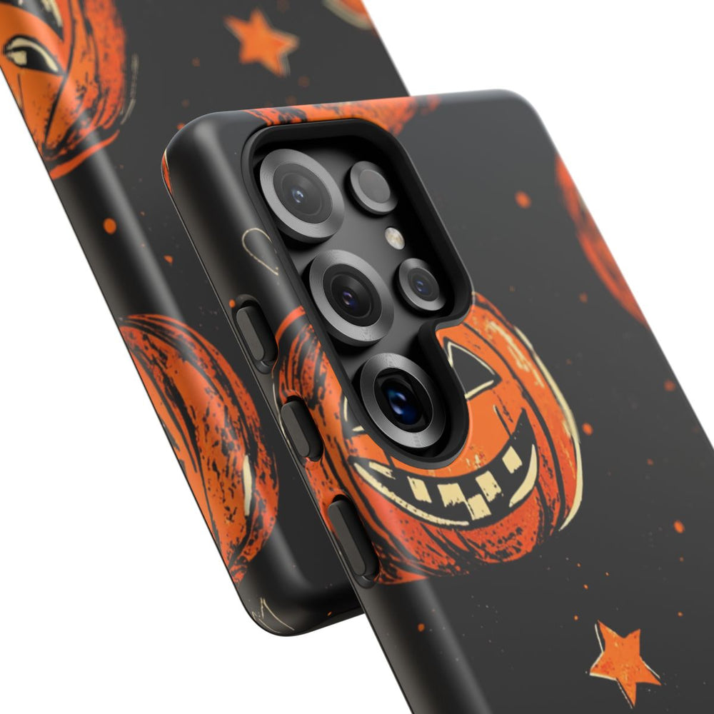 Dit hoesje heeft een speels en stoer ontwerp met een herhalend patroon van oranje pompoenen met uitgesneden gezichten, variërend van ondeugende tot vrolijke uitdrukkingen. De pompoenen zijn getekend in grunge-stijl met opvallende textuur en zwarte accenten. Kleine oranje sterretjes en stippen zijn verspreid over de effen zwarte achtergrond, wat zorgt voor een unieke Halloween-uitstraling. Het hoesje bestaat uit twee lagen (polycarbonaat en TPU) en is mat afgewerkt. Het biedt uitstekende bescherming, is bestand tegen weersinvloeden en ondersteunt draadloos opladen.