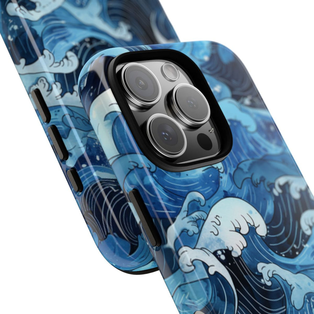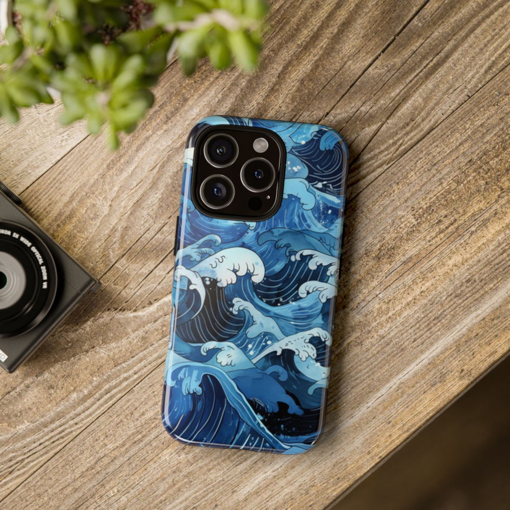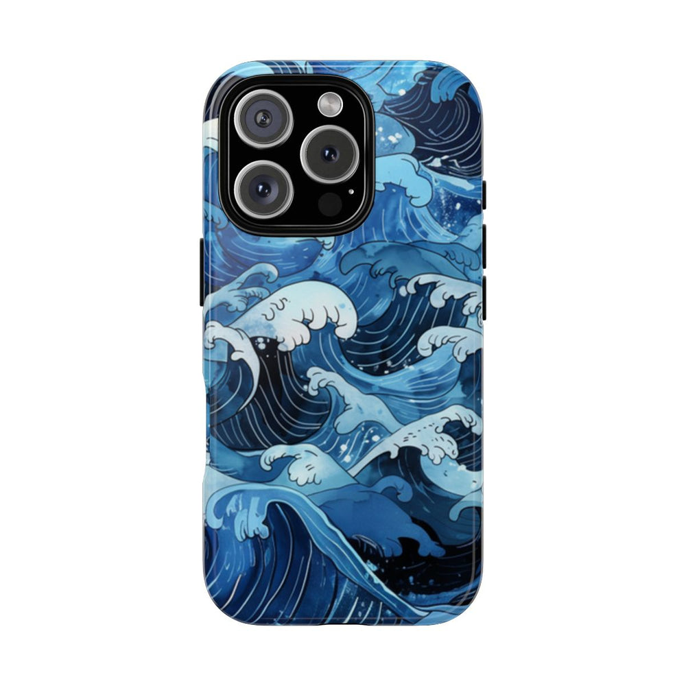 Dit hoesje is voorzien van een handgetekend patroon van oceaangolven, geïnspireerd op traditionele Japanse kunst. De golven zijn afgebeeld met vloeiende, gebogen lijnen en witte schuimkoppen, over verschillende tinten blauw. Het ontwerp is gedetailleerd met fijne zwarte contouren en aquarelstructuren, wat zorgt voor een levendige en ritmische zeescène. Het glanzende, stevige hoesje bestaat uit een dubbele laag voor extra stevigheid en bescherming, ondersteunt draadloos opladen en is bestand tegen weersinvloeden.