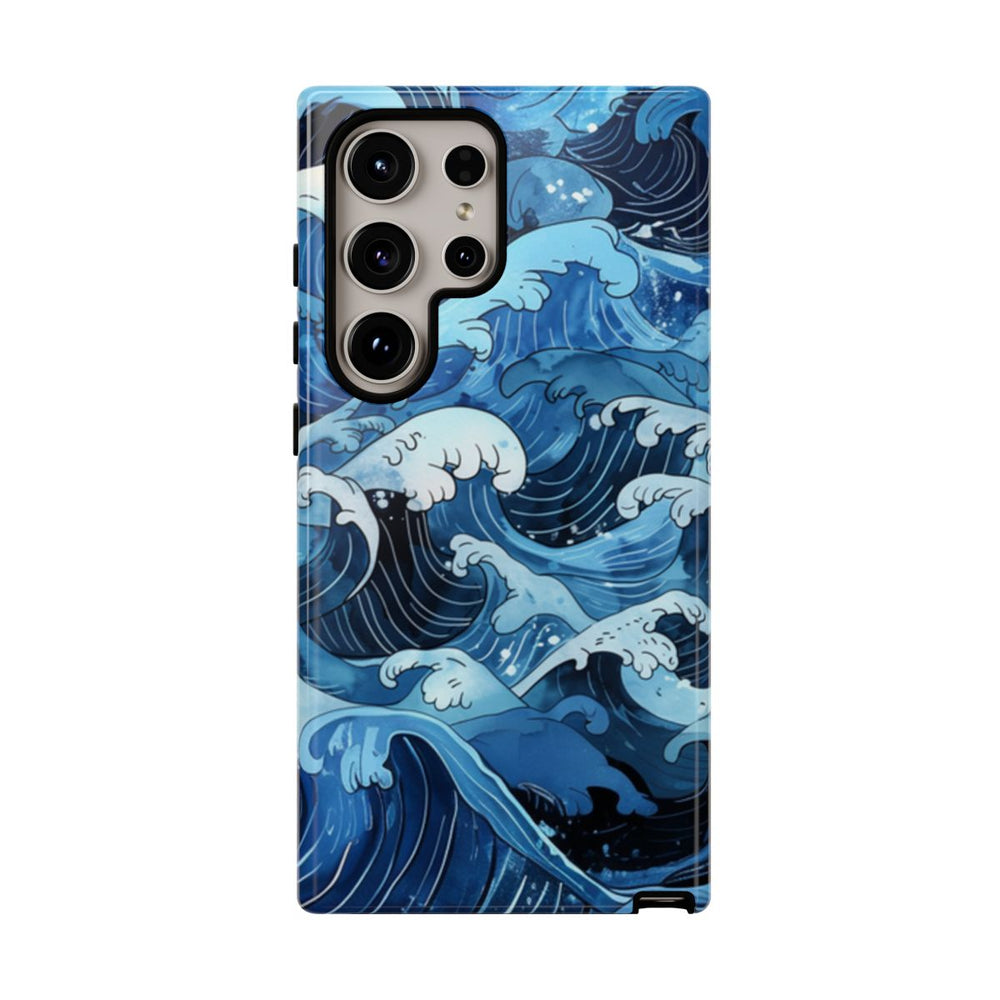 Dit hoesje is voorzien van een handgetekend patroon van oceaangolven, geïnspireerd op traditionele Japanse kunst. De golven zijn afgebeeld met vloeiende, gebogen lijnen en witte schuimkoppen, over verschillende tinten blauw. Het ontwerp is gedetailleerd met fijne zwarte contouren en aquarelstructuren, wat zorgt voor een levendige en ritmische zeescène. Het glanzende, stevige hoesje bestaat uit een dubbele laag voor extra stevigheid en bescherming, ondersteunt draadloos opladen en is bestand tegen weersinvloeden.