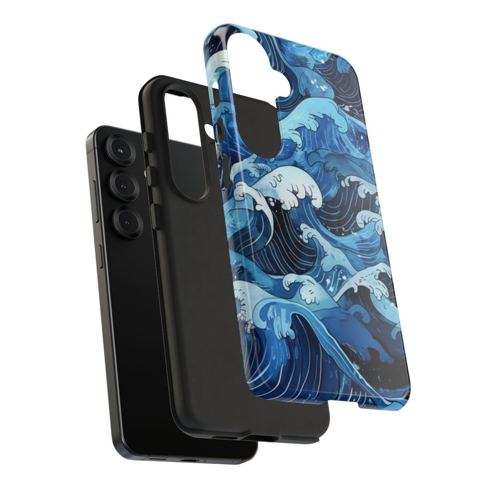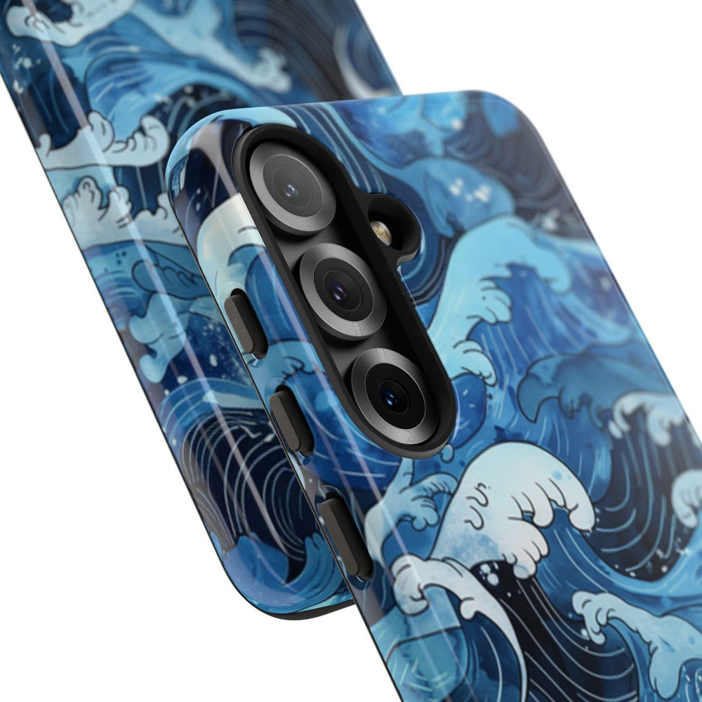 Dit hoesje is voorzien van een handgetekend patroon van oceaangolven, geïnspireerd op traditionele Japanse kunst. De golven zijn afgebeeld met vloeiende, gebogen lijnen en witte schuimkoppen, over verschillende tinten blauw. Het ontwerp is gedetailleerd met fijne zwarte contouren en aquarelstructuren, wat zorgt voor een levendige en ritmische zeescène. Het glanzende, stevige hoesje bestaat uit een dubbele laag voor extra stevigheid en bescherming, ondersteunt draadloos opladen en is bestand tegen weersinvloeden.