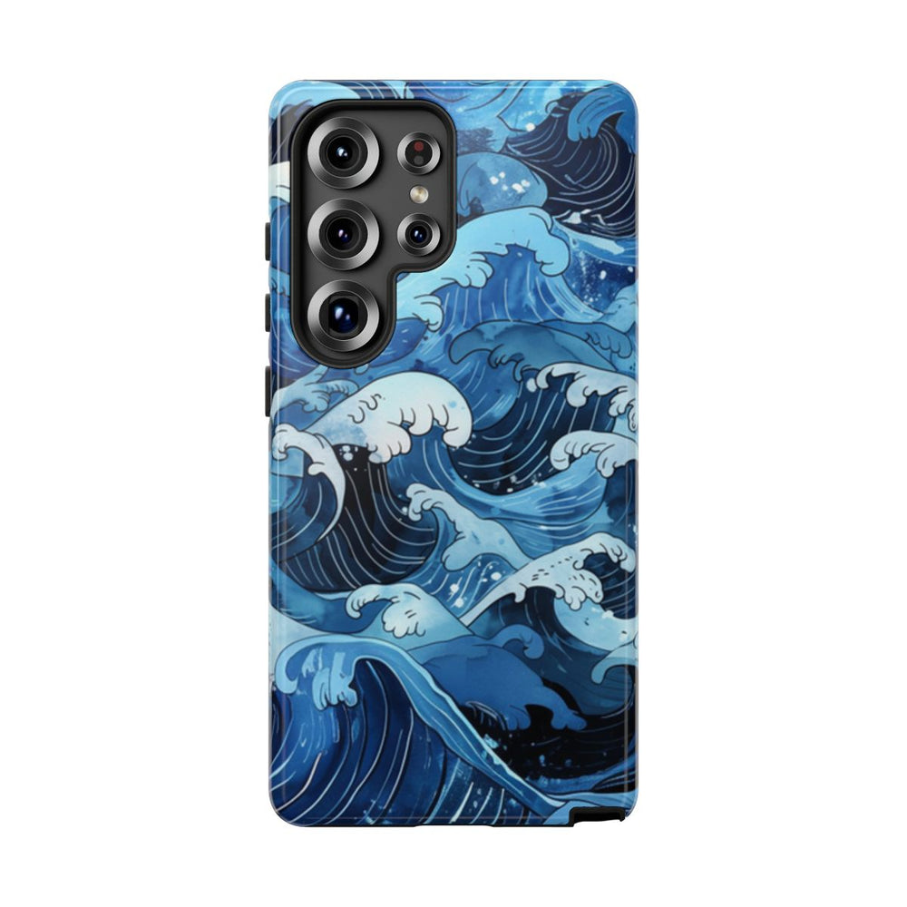 Dit hoesje is voorzien van een handgetekend patroon van oceaangolven, geïnspireerd op traditionele Japanse kunst. De golven zijn afgebeeld met vloeiende, gebogen lijnen en witte schuimkoppen, over verschillende tinten blauw. Het ontwerp is gedetailleerd met fijne zwarte contouren en aquarelstructuren, wat zorgt voor een levendige en ritmische zeescène. Het glanzende, stevige hoesje bestaat uit een dubbele laag voor extra stevigheid en bescherming, ondersteunt draadloos opladen en is bestand tegen weersinvloeden.