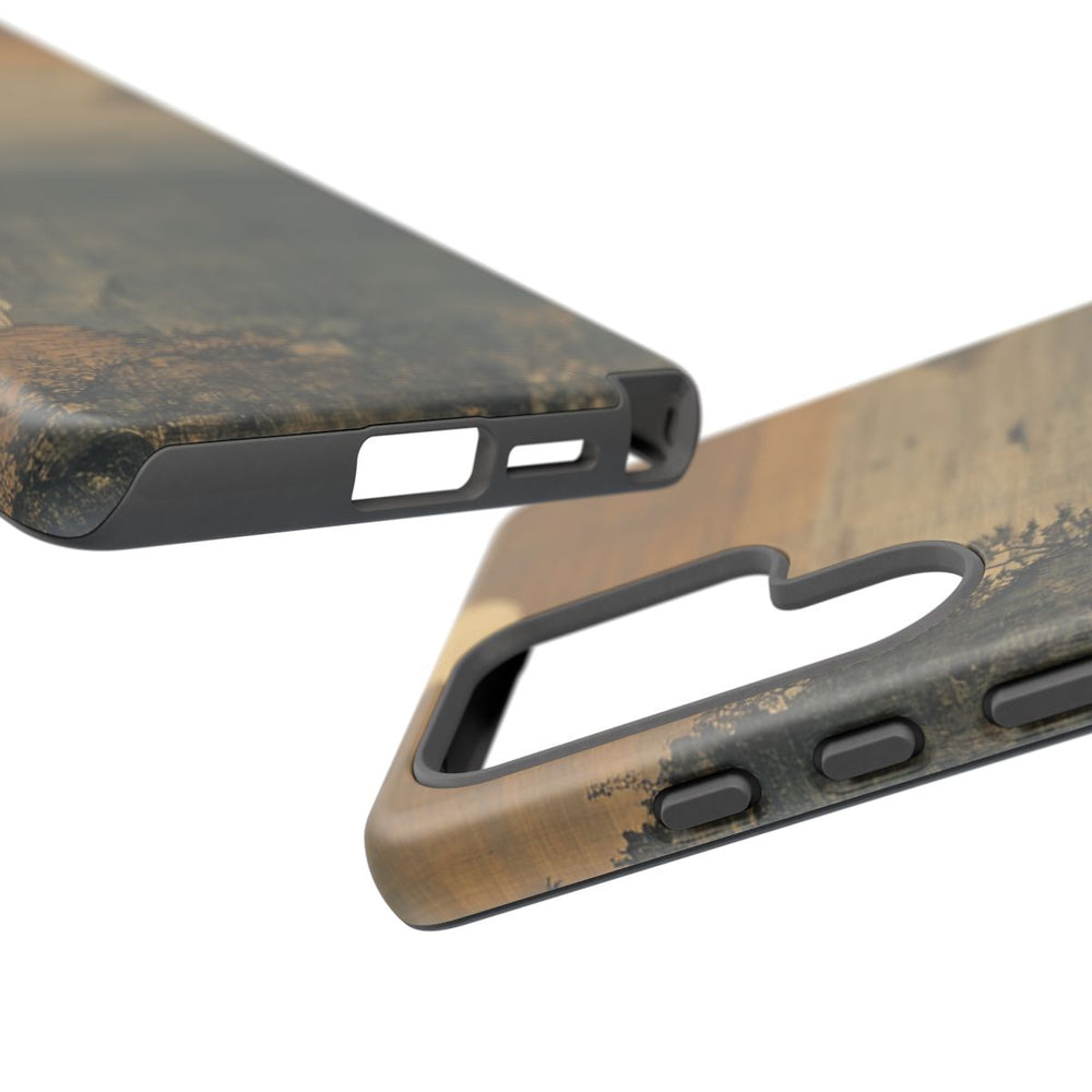 Dit telefoonhoesje toont een schildering in traditionele stijl van een vrouw in golvende gewaden op een rotsachtige klif, uitkijkend over een mistige zee onder een heldere volle maan. Het tafereel bevat ruige kliffen, spaarzame bomen en afgelegen rotseilanden die uit het water oprijzen. De kleuren bestaan vooral uit zachte bruin- en blauwtinten, wat zorgt voor een serene sfeer in de nacht. Het hoesje heeft een dubbele laag met een polycarbonaat buitenkant en een TPU-binnenzijde, wat zorgt voor extra bescherming en ondersteuning van draadloos opladen.