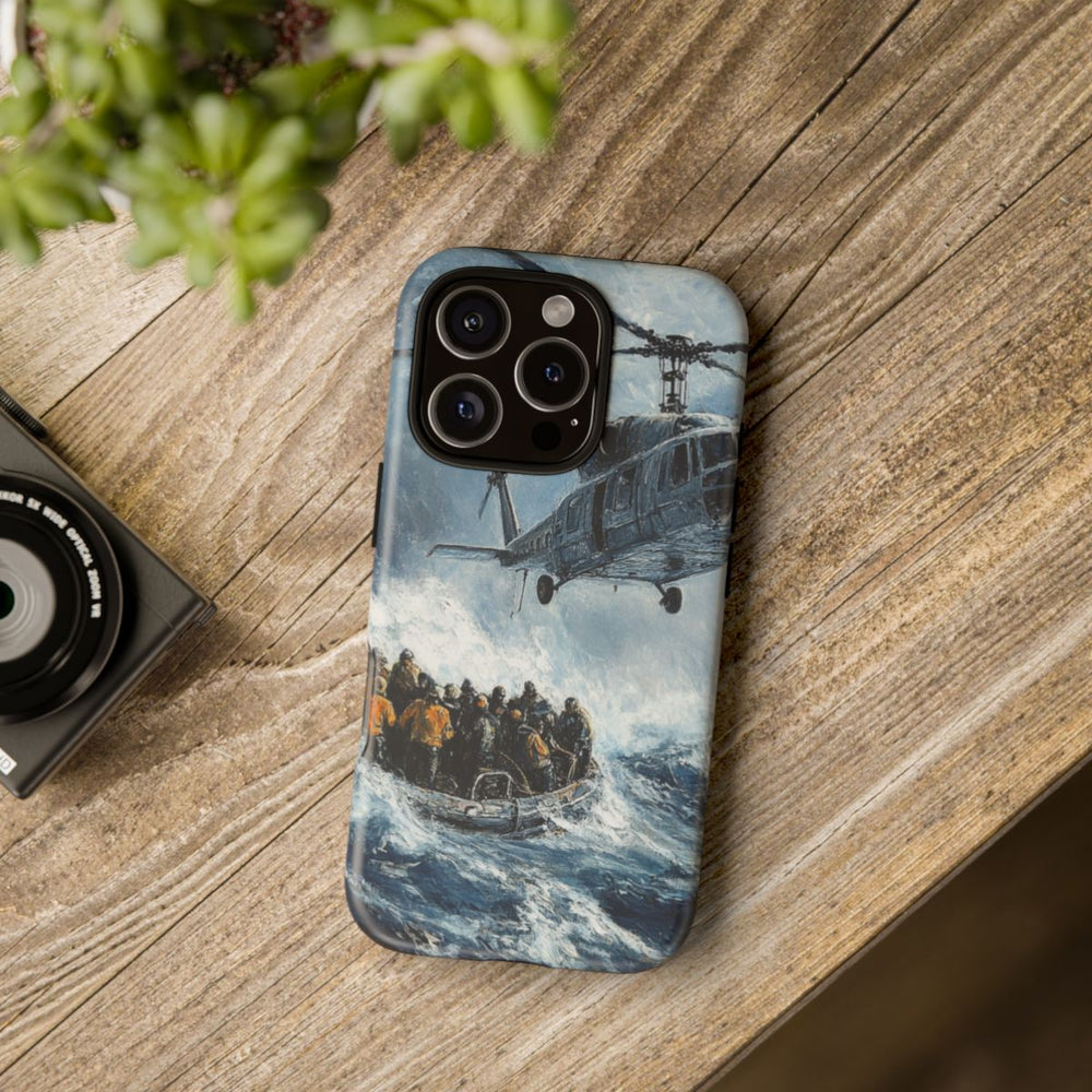 Dit hoesje toont een olieverfschilderij van een helikopter die boven een reddingsboot vol mensen zweeft op een woeste, onstuimige zee. De lucht is zwaar bewolkt en stormachtig, wat de dramatische reddingsactie benadrukt. In de reddingsboot zitten veel mensen met oranje reddingsvesten. Het hoesje heeft een dubbele laag met een polycarbonaat buitenkant en een TPU-binnenzijde. Ondersteunt draadloos opladen, maar is niet geschikt voor MagSafe.
