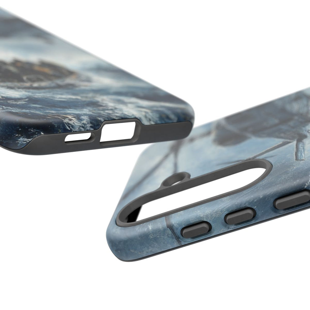 Dit telefoonhoesje toont een olieverfschilderij van een helikopter die boven een reddingsboot zweeft, gevuld met mensen die zich in onstuimige, ruwe zeeën bevinden. Het tafereel is dramatisch, met donkere blauw- en grijstinten die de stormachtige lucht en het woelige water bepalen. De mensen in de reddingsboot dragen oranje jassen, wat sterk afsteekt tegen de donkere kleuren van het water en de lucht. Het matte, stevige hoesje is vervaardigd uit polycarbonaat en TPU, ontworpen voor extra duurzaamheid en bestand tegen gebruik buitenshuis. Geschikt voor draadloos opladen.