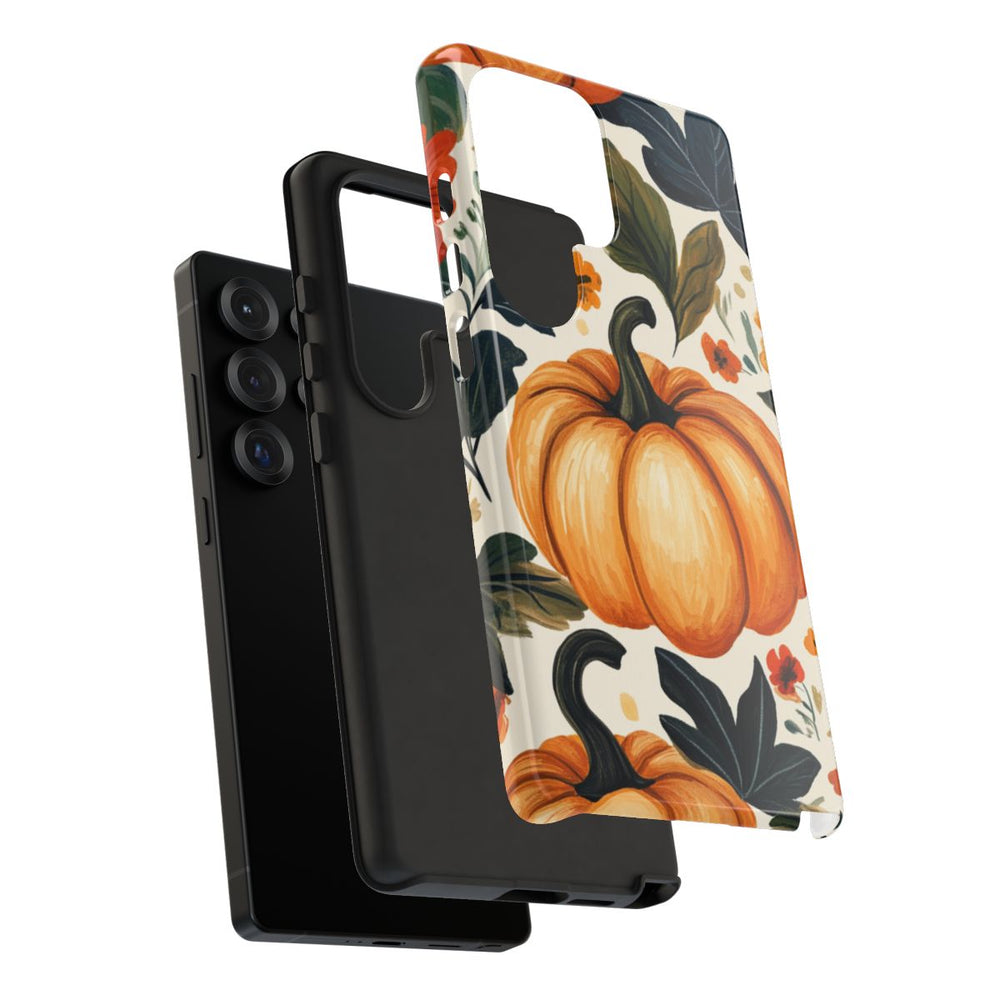 Dit hoesje heeft een herhalend patroon van getekende pompoenen en verschillende bloemen in warme herfstkleuren. De pompoenen zijn geschilderd in oranje tinten met groene stelen en worden omringd door bladeren in donkergroene en blauwe kleuren. De bloemen bestaan uit rode, oranje en gele bloesems met gedetailleerde blaadjes en donkere harten. De achtergrond is zacht ivoorkleurig, wat zorgt voor een knusse, herfstachtige uitstraling. Het hoesje bestaat uit een dubbele laag van een polycarbonaat buitenkant en een TPU binnenzijde voor extra bescherming en is geschikt voor draadloos opladen.