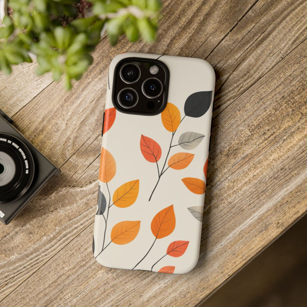 Dit hoesje heeft een eenvoudig, geïllustreerd patroon van herfstbladeren in verschillende tinten oranje, geel, beige, grijs en zwart. De bladeren zijn verbonden aan dunne zwarte takjes en gelijkmatig verspreid over een lichte, offwhite achtergrond. Het ontwerp is strak en minimalistisch, en straalt een sfeervol herfstgevoel uit. Het hoesje bestaat uit twee lagen met een matte afwerking: een stevige polycarbonaat buitenkant en een TPU-binnenkant voor extra stevigheid en bescherming. Ondersteunt draadloos opladen.