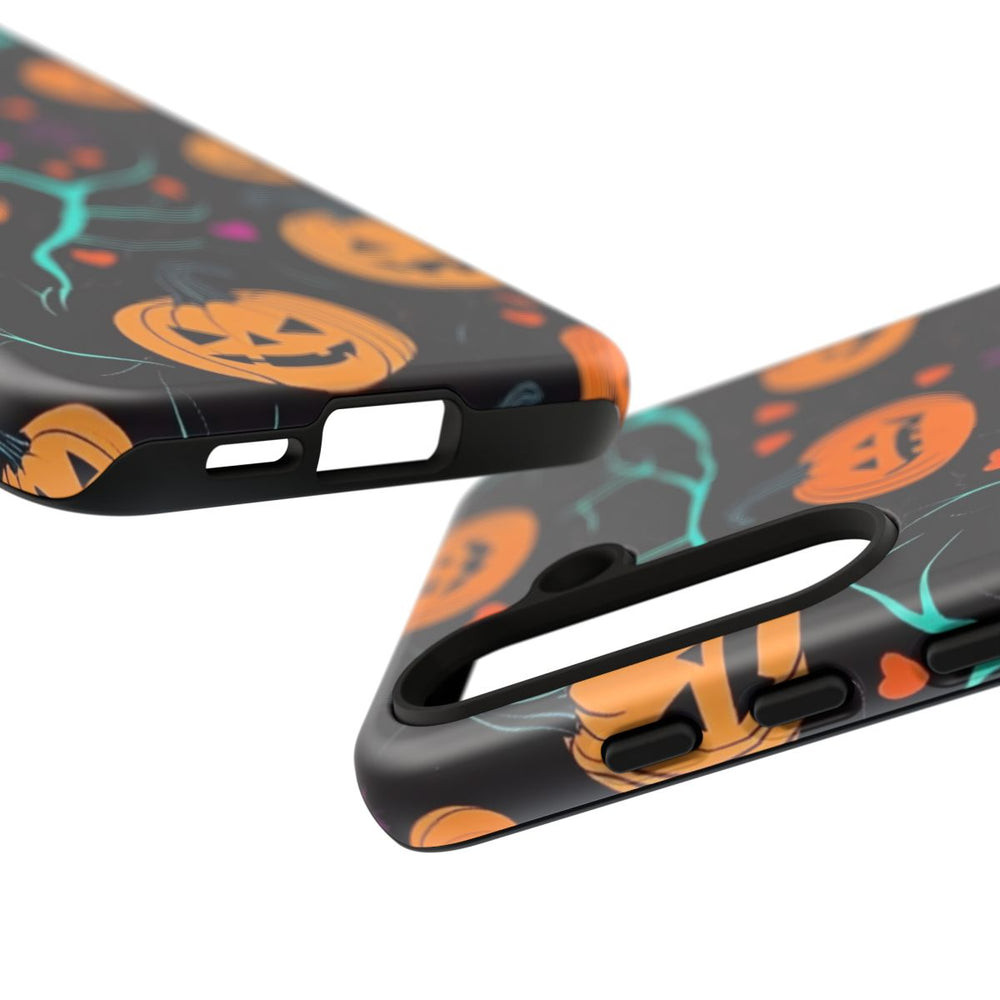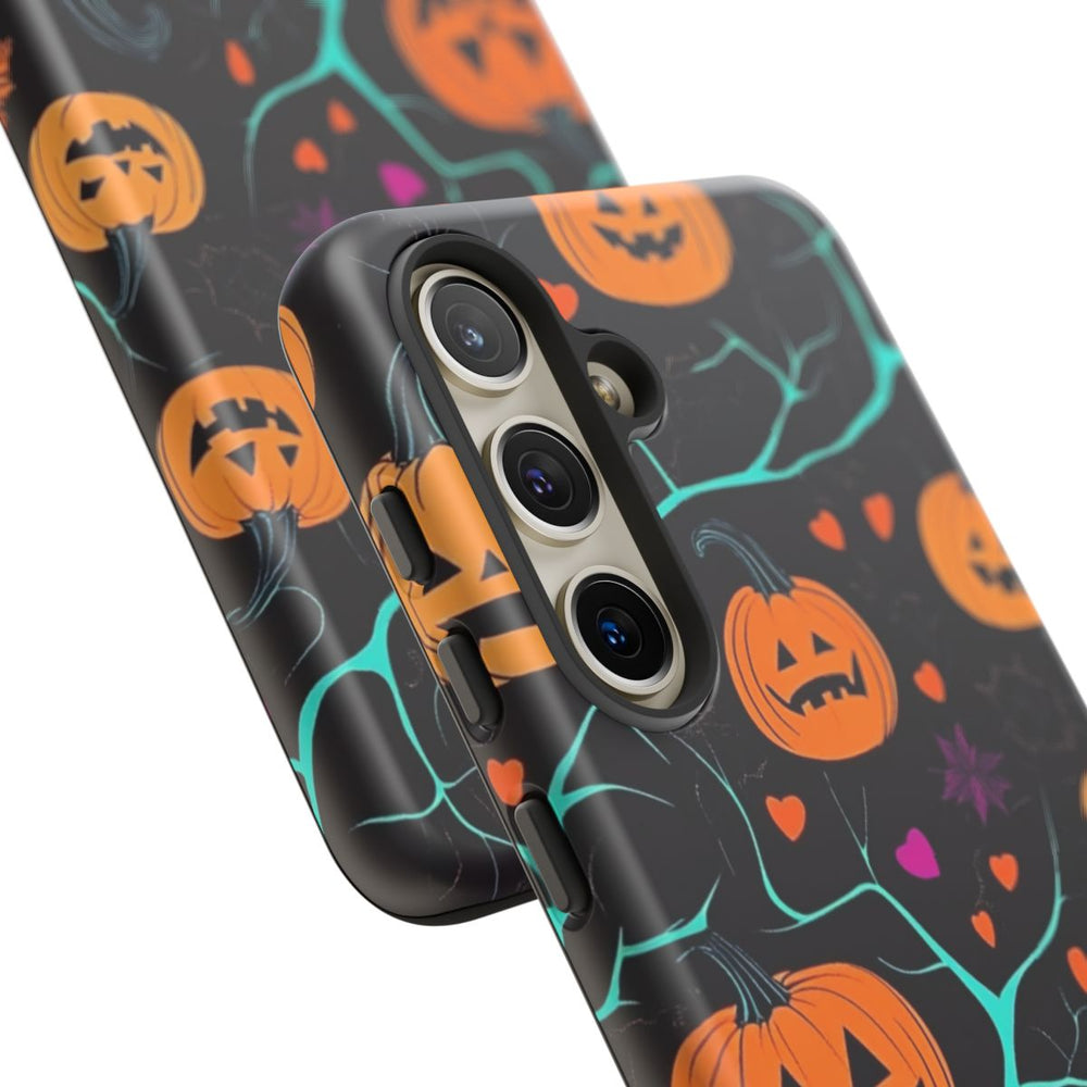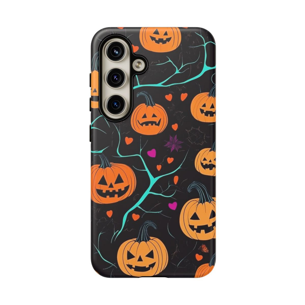 Dit telefoonhoesje is versierd met een herhalend patroon van feloranje pompoenen met uitgesneden gezichten op een zwarte achtergrond. Tussen de pompoenen vind je blauwe takjes en kleine oranje en roze hartjes. Daarnaast zijn er subtiele paarse en oranje bloemelementen in het ontwerp verwerkt. Het hoesje bestaat uit twee stevige lagen met een matte afwerking: een buitenkant van polycarbonaat en een binnenzijde van TPU. Dit zorgt voor extra bescherming en maakt draadloos opladen mogelijk.