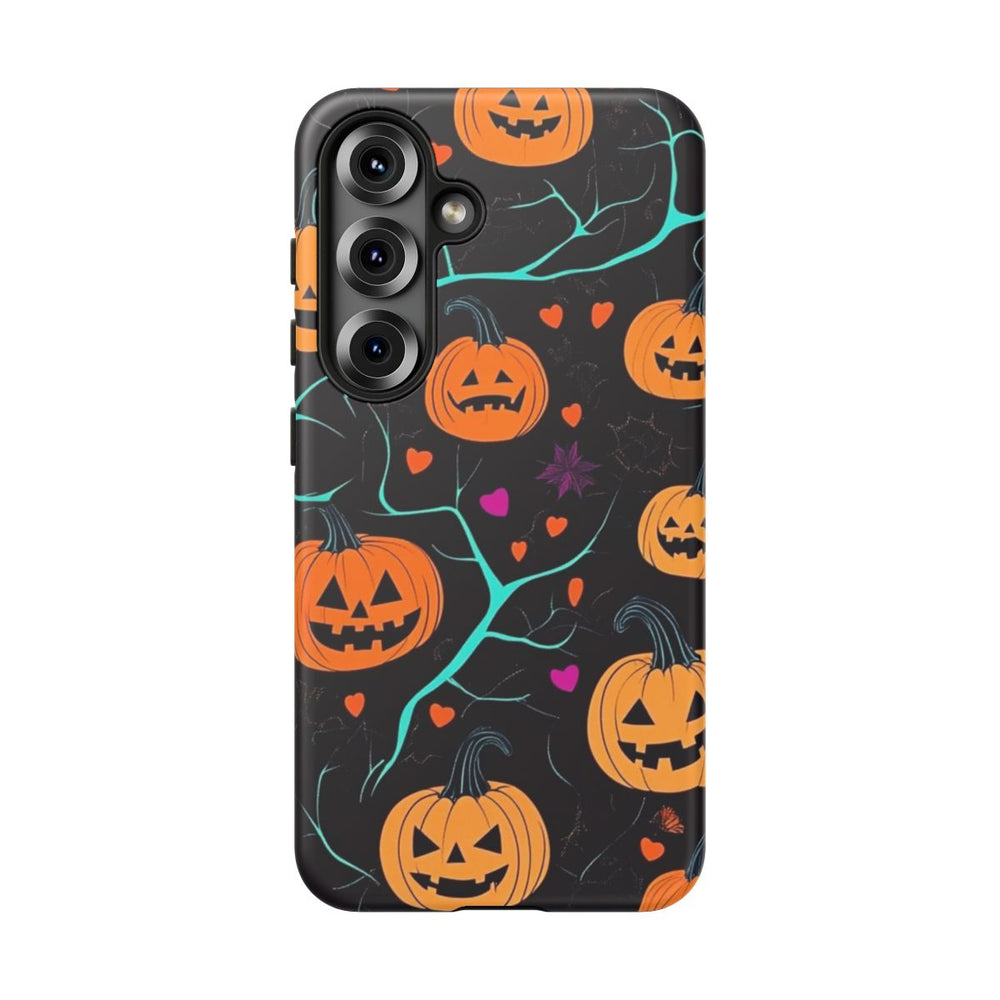 Dit telefoonhoesje is versierd met een herhalend patroon van feloranje pompoenen met uitgesneden gezichten op een zwarte achtergrond. Tussen de pompoenen vind je blauwe takjes en kleine oranje en roze hartjes. Daarnaast zijn er subtiele paarse en oranje bloemelementen in het ontwerp verwerkt. Het hoesje bestaat uit twee stevige lagen met een matte afwerking: een buitenkant van polycarbonaat en een binnenzijde van TPU. Dit zorgt voor extra bescherming en maakt draadloos opladen mogelijk.
