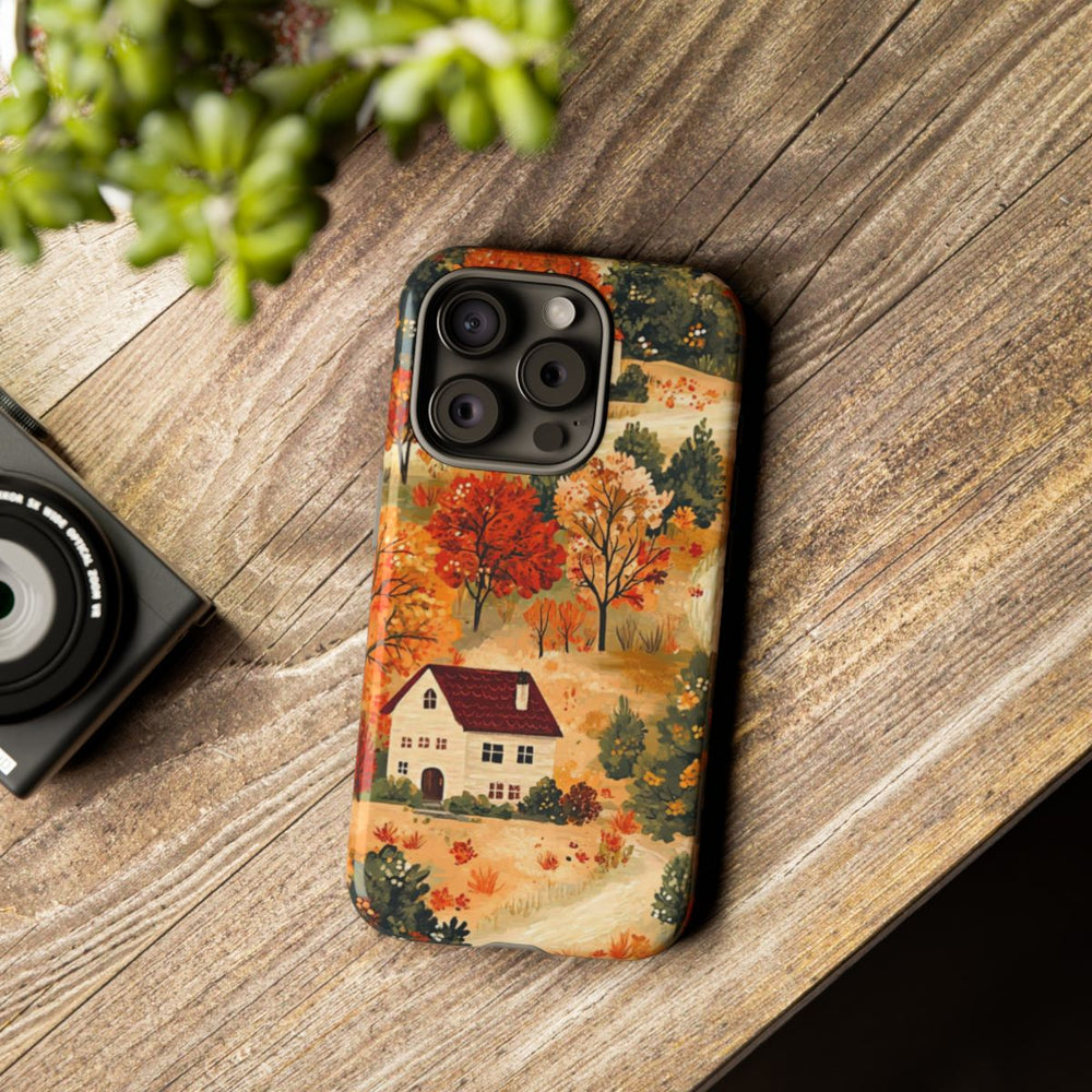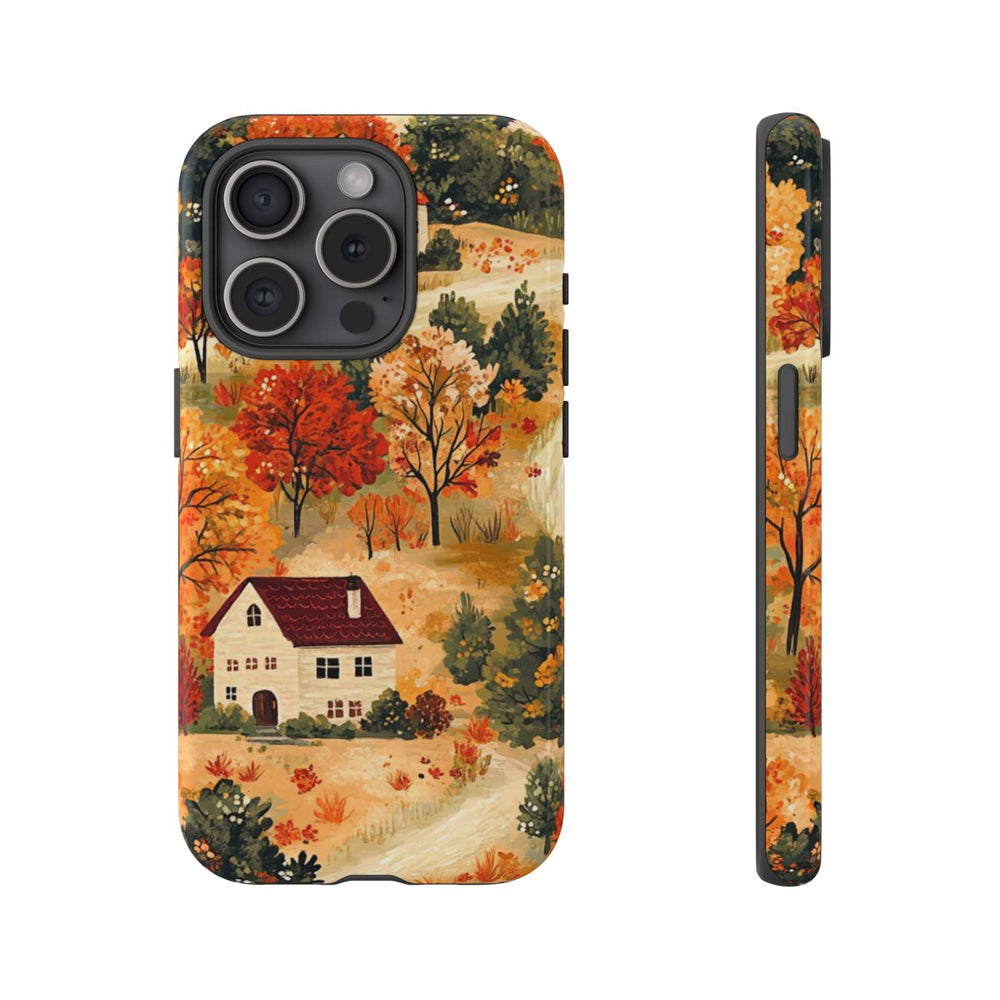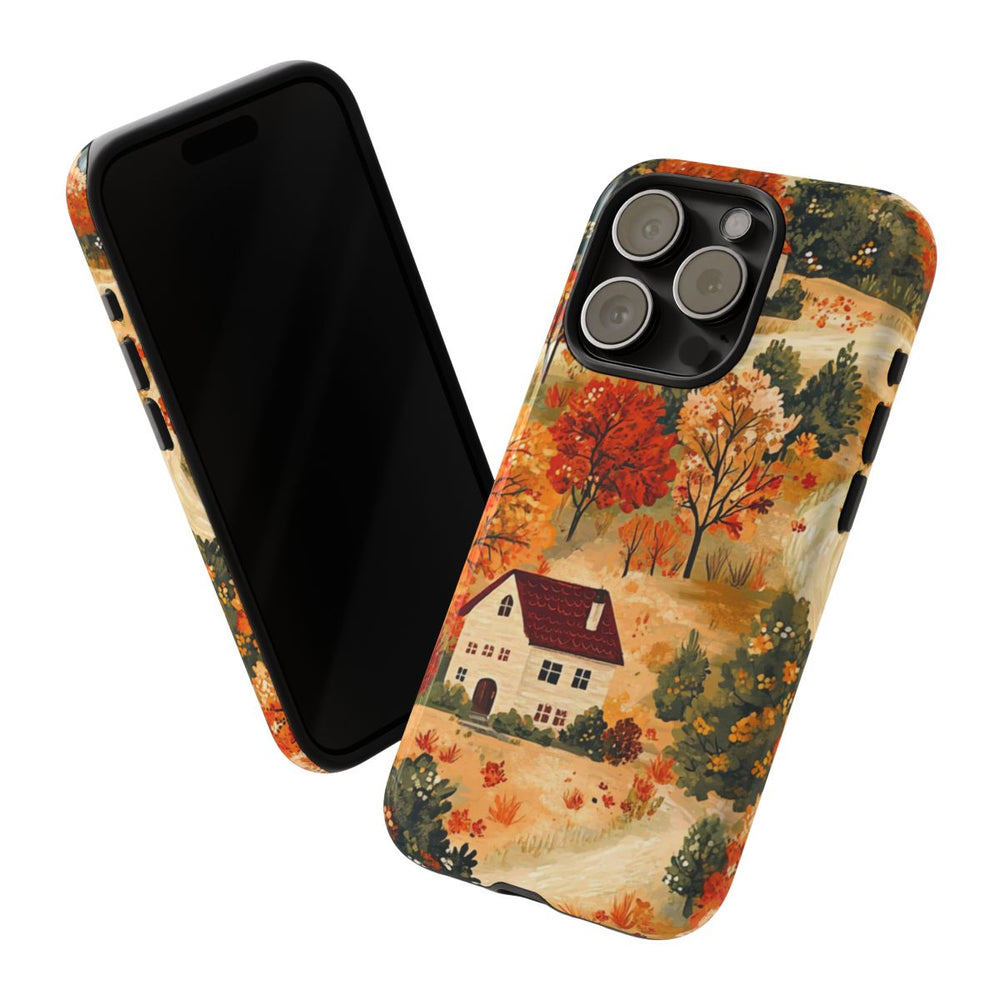 Dit ontwerp toont een sfeervol herfstlandschap met twee witte huizen, omringd door kleurrijke herfstbladeren. De bomen hebben bladeren in warme tinten oranje, rood, geel en groen, wat zorgt voor een gezellige en uitnodigende uitstraling. Kronkelende paadjes lopen door het tafereel en geven diepte en dynamiek aan het geheel. De afbeelding is gedrukt op een glanzend, stevig hoesje met een polycarbonaat buitenkant en een TPU binnenlaag, voor optimale bescherming en ondersteuning van draadloos opladen. De stijl is schilderachtig en gedetailleerd en vangt de sfeer van de herfst perfect.