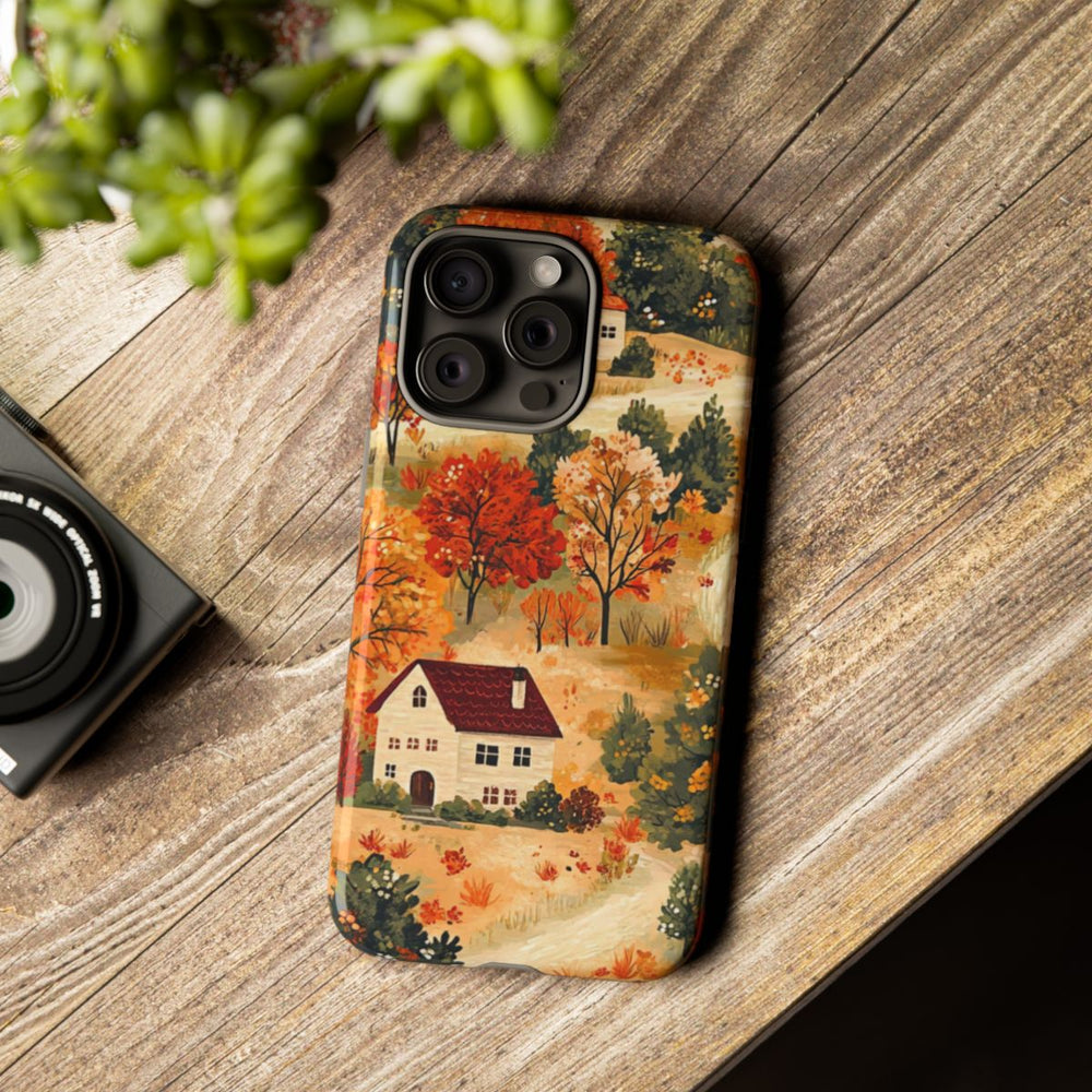 Dit ontwerp toont een sfeervol herfstlandschap met twee witte huizen, omringd door kleurrijke herfstbladeren. De bomen hebben bladeren in warme tinten oranje, rood, geel en groen, wat zorgt voor een gezellige en uitnodigende uitstraling. Kronkelende paadjes lopen door het tafereel en geven diepte en dynamiek aan het geheel. De afbeelding is gedrukt op een glanzend, stevig hoesje met een polycarbonaat buitenkant en een TPU binnenlaag, voor optimale bescherming en ondersteuning van draadloos opladen. De stijl is schilderachtig en gedetailleerd en vangt de sfeer van de herfst perfect.
