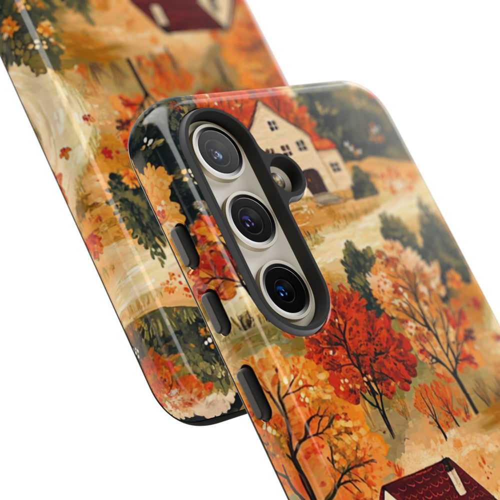 Dit ontwerp toont een sfeervol herfstlandschap met twee witte huizen, omringd door kleurrijke herfstbladeren. De bomen hebben bladeren in warme tinten oranje, rood, geel en groen, wat zorgt voor een gezellige en uitnodigende uitstraling. Kronkelende paadjes lopen door het tafereel en geven diepte en dynamiek aan het geheel. De afbeelding is gedrukt op een glanzend, stevig hoesje met een polycarbonaat buitenkant en een TPU binnenlaag, voor optimale bescherming en ondersteuning van draadloos opladen. De stijl is schilderachtig en gedetailleerd en vangt de sfeer van de herfst perfect.
