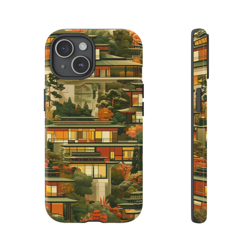 Dit hoesje heeft een patroon van moderne gebouwen, omringd door weelderige bomen en bladeren in warme herfstkleuren. De gebouwen zijn voorzien van grote ramen met een zachte gele en oranje gloed, tegen een achtergrond van groene en oranje bomen. Het ontwerp zorgt voor een rustige, door de natuur geïnspireerde uitstraling waarin architectuur en landschap mooi samenkomen. Het hoesje bestaat uit een stevige polycarbonaat buitenkant en een TPU binnenzijde, voor extra bescherming en ondersteuning van draadloos opladen.