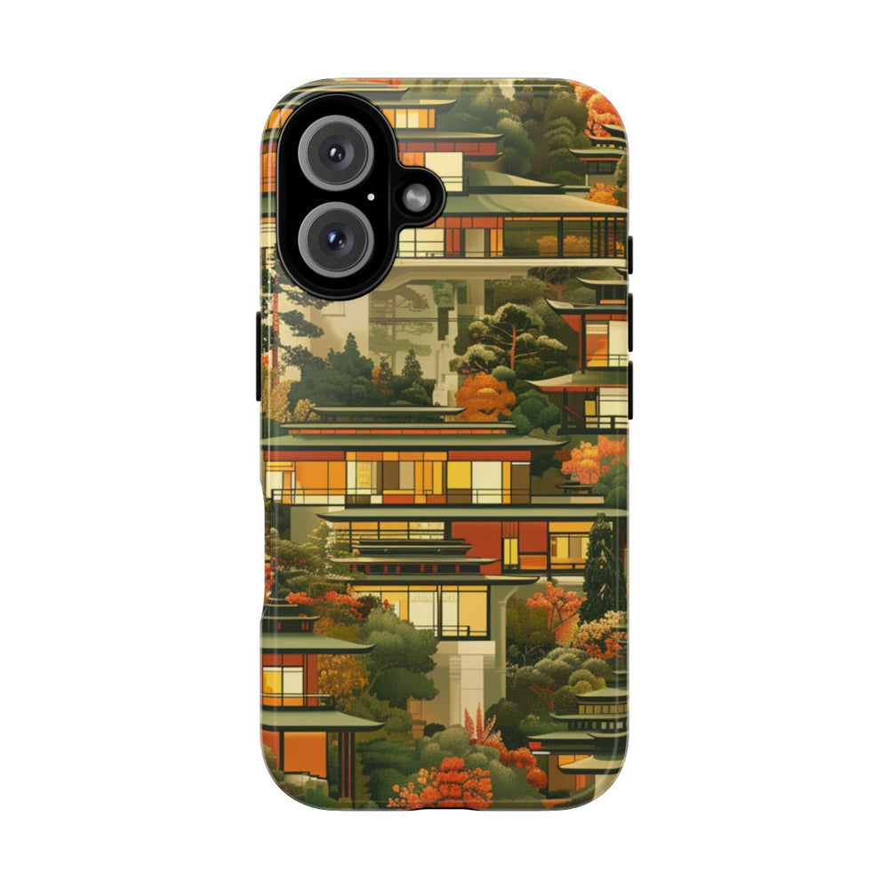 Dit hoesje heeft een patroon van moderne gebouwen, omringd door weelderige bomen en bladeren in warme herfstkleuren. De gebouwen zijn voorzien van grote ramen met een zachte gele en oranje gloed, tegen een achtergrond van groene en oranje bomen. Het ontwerp zorgt voor een rustige, door de natuur geïnspireerde uitstraling waarin architectuur en landschap mooi samenkomen. Het hoesje bestaat uit een stevige polycarbonaat buitenkant en een TPU binnenzijde, voor extra bescherming en ondersteuning van draadloos opladen.