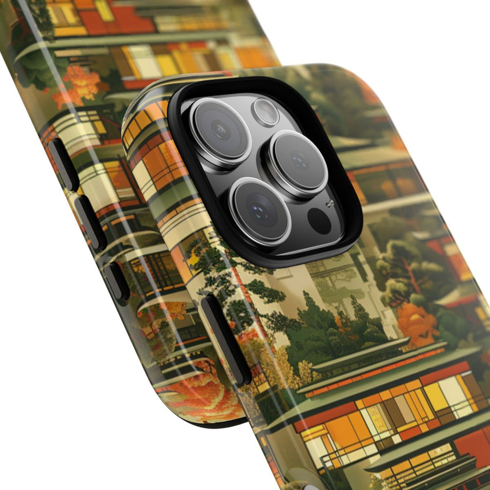Dit hoesje heeft een patroon van moderne gebouwen, omringd door weelderige bomen en bladeren in warme herfstkleuren. De gebouwen zijn voorzien van grote ramen met een zachte gele en oranje gloed, tegen een achtergrond van groene en oranje bomen. Het ontwerp zorgt voor een rustige, door de natuur geïnspireerde uitstraling waarin architectuur en landschap mooi samenkomen. Het hoesje bestaat uit een stevige polycarbonaat buitenkant en een TPU binnenzijde, voor extra bescherming en ondersteuning van draadloos opladen.