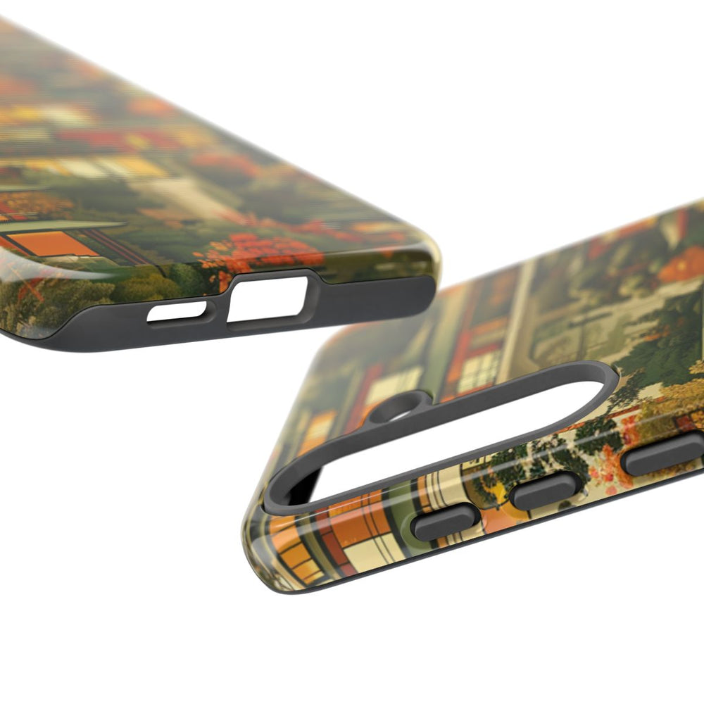 Dit hoesje heeft een patroon van moderne gebouwen, omringd door weelderige bomen en bladeren in warme herfstkleuren. De gebouwen zijn voorzien van grote ramen met een zachte gele en oranje gloed, tegen een achtergrond van groene en oranje bomen. Het ontwerp zorgt voor een rustige, door de natuur geïnspireerde uitstraling waarin architectuur en landschap mooi samenkomen. Het hoesje bestaat uit een stevige polycarbonaat buitenkant en een TPU binnenzijde, voor extra bescherming en ondersteuning van draadloos opladen.