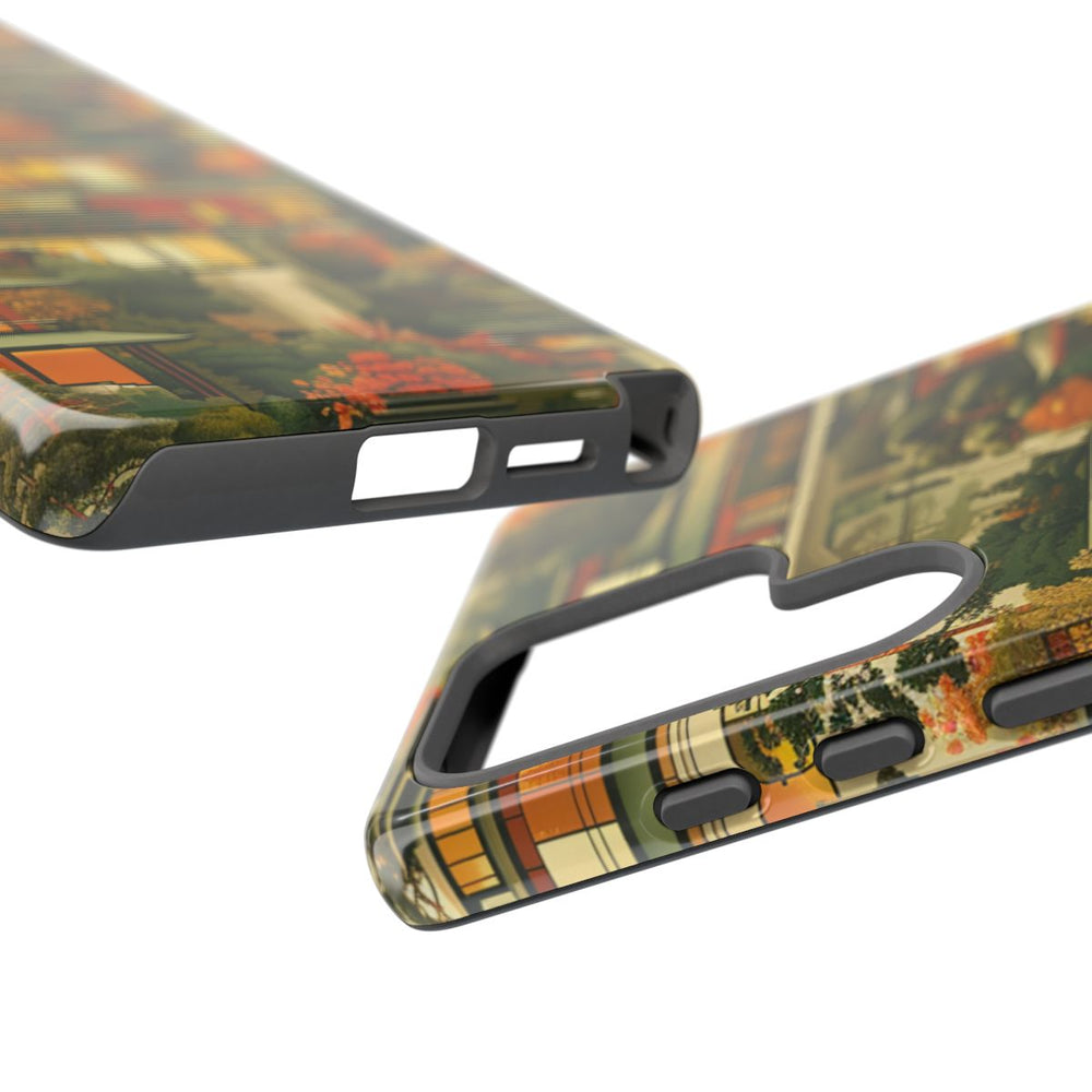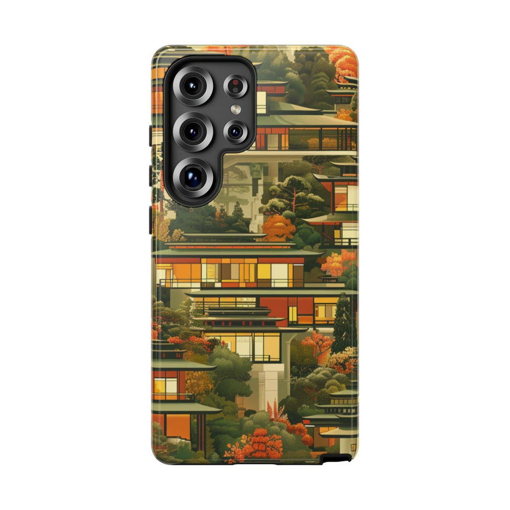 Dit hoesje heeft een patroon van moderne gebouwen, omringd door weelderige bomen en bladeren in warme herfstkleuren. De gebouwen zijn voorzien van grote ramen met een zachte gele en oranje gloed, tegen een achtergrond van groene en oranje bomen. Het ontwerp zorgt voor een rustige, door de natuur geïnspireerde uitstraling waarin architectuur en landschap mooi samenkomen. Het hoesje bestaat uit een stevige polycarbonaat buitenkant en een TPU binnenzijde, voor extra bescherming en ondersteuning van draadloos opladen.