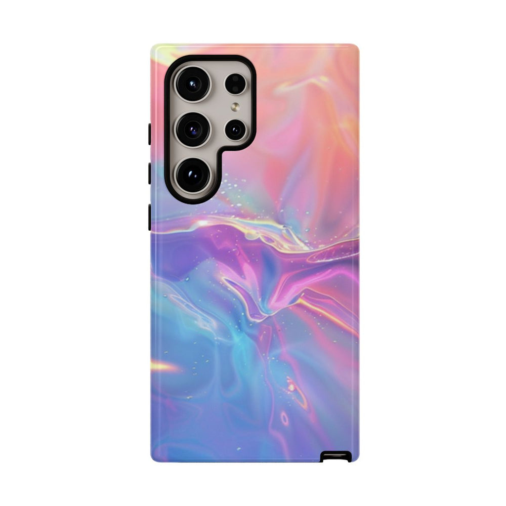 Dit telefoonhoesje heeft een gladde, holografische gradient met een zachte structuur. De kleuren lopen vloeiend over van zachte roze- en paarstinten naar lichtblauw en turquoise, wat zorgt voor een sprankelend, iriserend effect. De glanzende afwerking versterkt de levendige, veranderende kleuren en geeft diepte en dynamiek aan het ontwerp. Het hoesje bestaat uit twee lagen: een stevige polycarbonaat buitenkant en een TPU-binnenzijde voor extra bescherming. Geschikt voor draadloos opladen en bestand tegen gebruik buitenshuis.