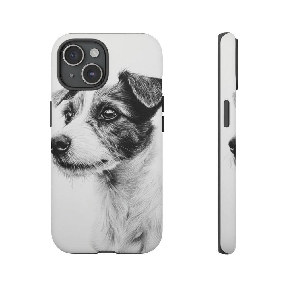 Dit telefoonhoesje is voorzien van een gedetailleerd portret van een hond, getekend in houtskool en grafiet. De hond met zwart-witte vacht is in profiel afgebeeld tegen een witte achtergrond, waarbij de textuur van de vacht en de glans in de ogen realistisch zijn weergegeven. Het matte hoesje bestaat uit een stevige polycarbonaat buitenkant en een TPU-binnenlaag, wat zorgt voor dubbele bescherming. Het hoesje ondersteunt draadloos opladen, is duurzaam en bestand tegen gebruik buitenshuis.