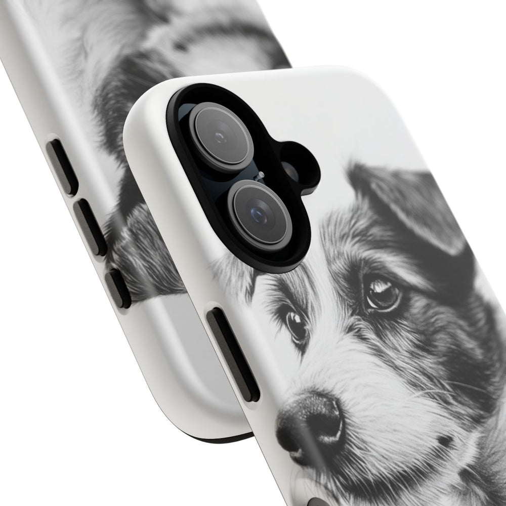 Dit hoesje toont een gedetailleerd zwart-wit portret van een hond, getekend met houtskool en grafiet. De hond is in profiel afgebeeld tegen een effen witte achtergrond. Het hoesje bestaat uit twee lagen: een stevige polycarbonaat buitenkant en een TPU-binnenlaag voor extra bescherming. Ondersteunt draadloos opladen en is ontworpen om bestand te zijn tegen weersinvloeden, terwijl de helderheid behouden blijft.