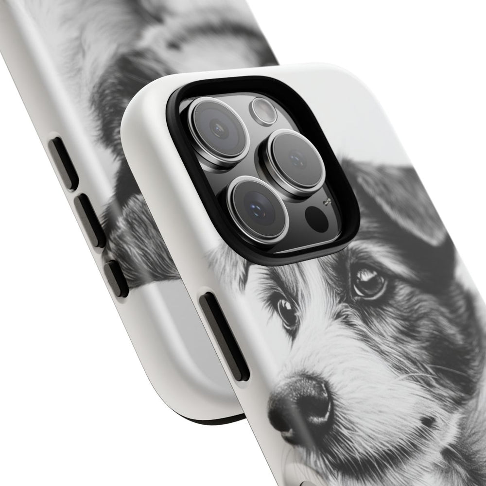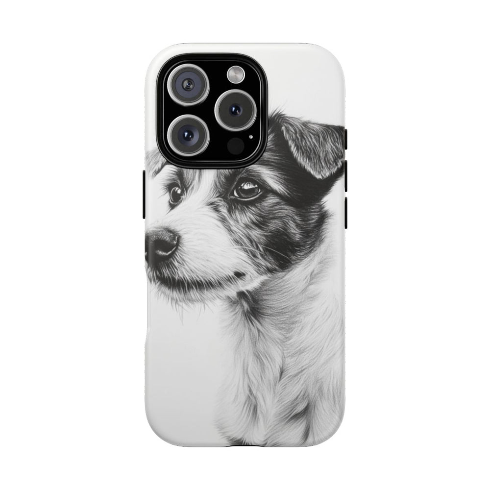 Dit telefoonhoesje is voorzien van een gedetailleerd portret van een hond, getekend in houtskool en grafiet. De hond, met een opvallend wit en donker vachtpatroon, is in profiel afgebeeld tegen een effen witte achtergrond. Het matte hoesje heeft een stevige dubbele laag van polycarbonaat en TPU voor optimale bescherming. Ondersteunt draadloos opladen, maar is niet geschikt voor MagSafe.