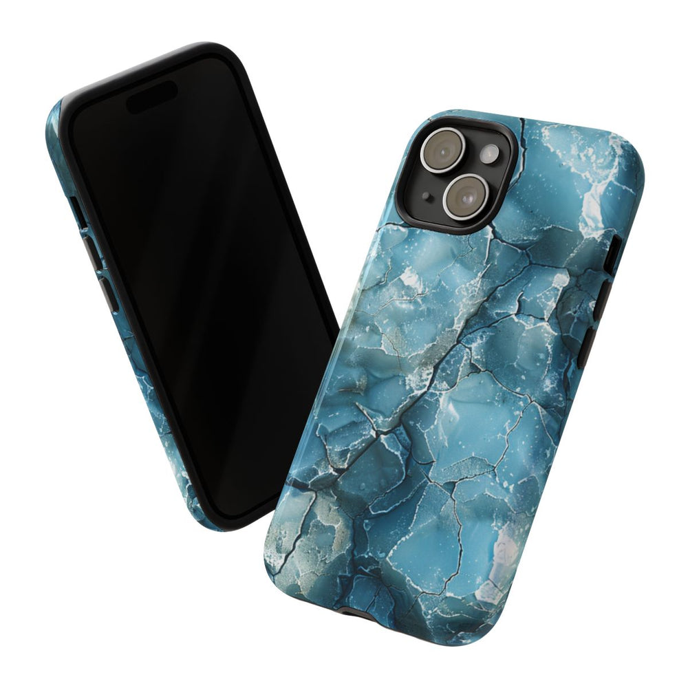 Dit ontwerp toont een naadloos fractalpatroon dat lijkt op gebarsten ijs met een stoere, getextureerde uitstraling. De afbeelding bestaat uit diverse blauwtinten, fijne barsten en subtiele witte accenten, wat zorgt voor een ruwe en natuurlijke ijzige look. Het licht komt van recht achter de camera, waardoor de structuur egaal wordt verlicht zonder schaduwen. Het patroon is bedrukt op een glanzend, stevig hoesje van polycarbonaat en TPU, dat bestaat uit twee beschermende lagen en geschikt is voor draadloos opladen.