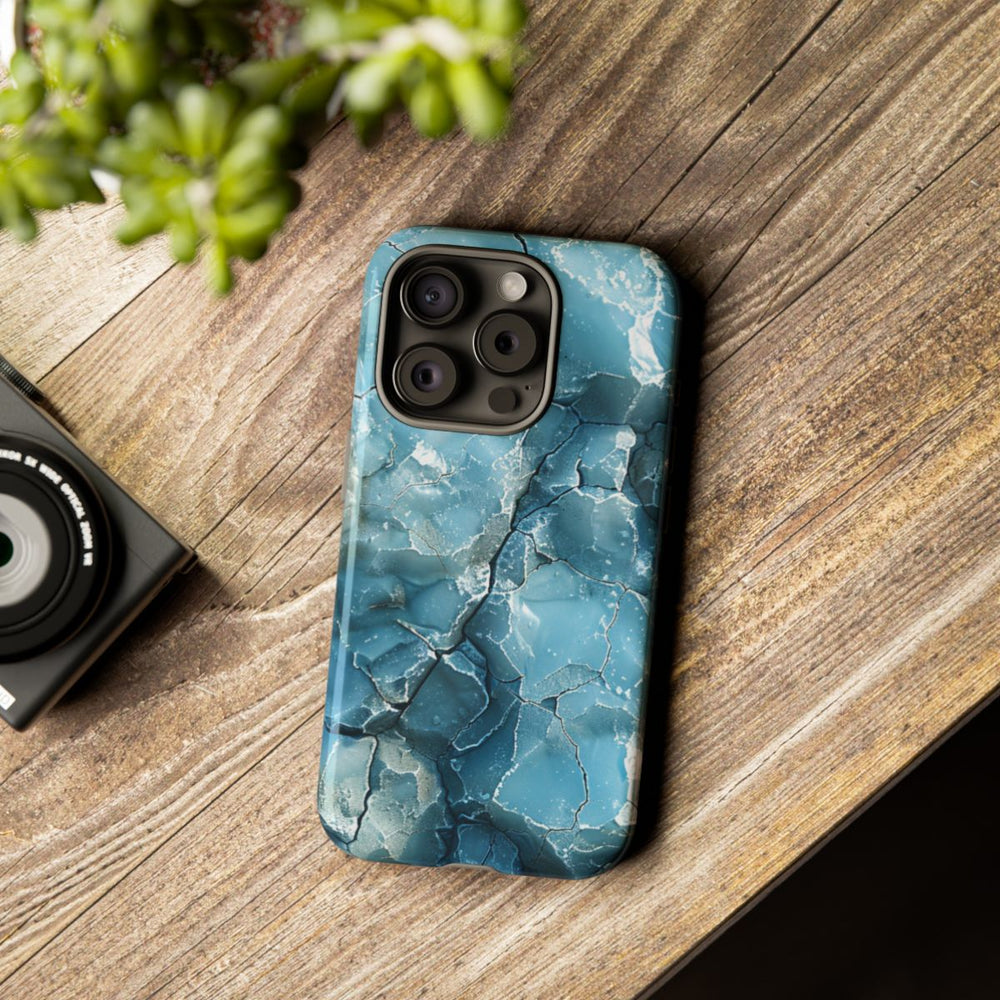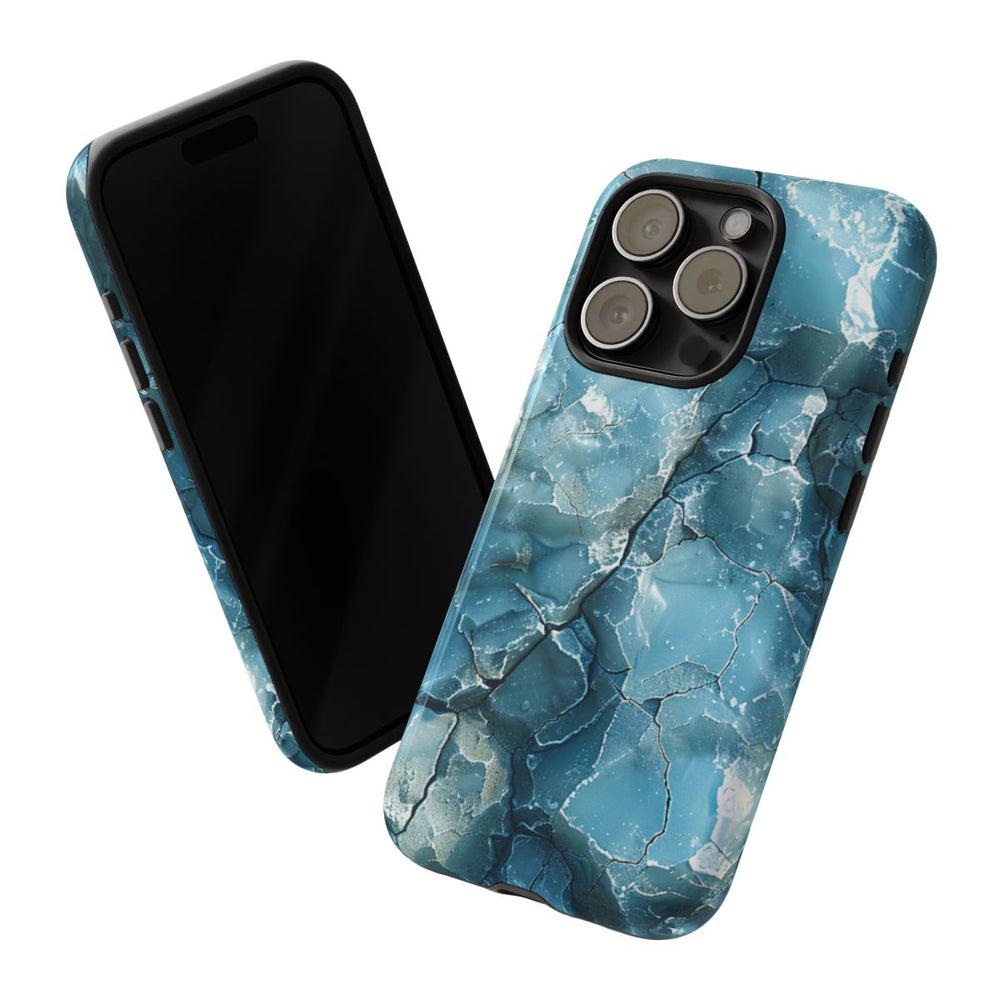 Dit ontwerp toont een naadloos fractalpatroon dat lijkt op gebarsten ijs met een stoere, getextureerde uitstraling. De afbeelding bestaat uit diverse blauwtinten, fijne barsten en subtiele witte accenten, wat zorgt voor een ruwe en natuurlijke ijzige look. Het licht komt van recht achter de camera, waardoor de structuur egaal wordt verlicht zonder schaduwen. Het patroon is bedrukt op een glanzend, stevig hoesje van polycarbonaat en TPU, dat bestaat uit twee beschermende lagen en geschikt is voor draadloos opladen.
