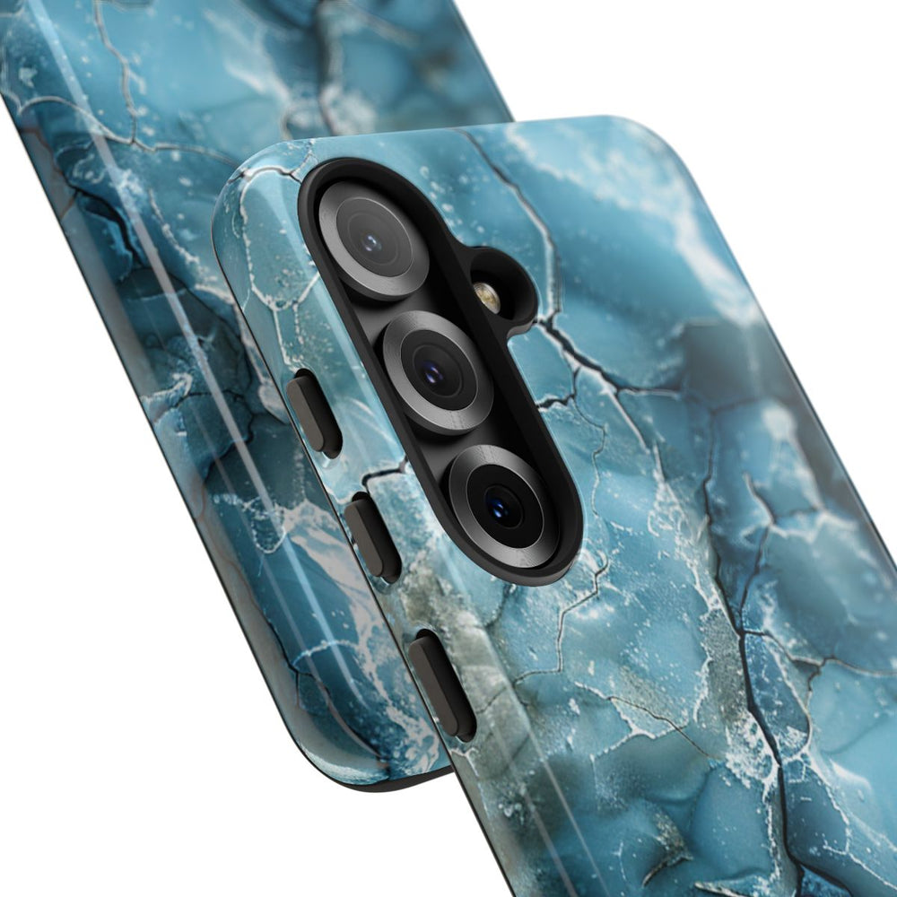 Dit ontwerp toont een naadloos fractalpatroon dat lijkt op gebarsten ijs met een stoere, getextureerde uitstraling. De afbeelding bestaat uit diverse blauwtinten, fijne barsten en subtiele witte accenten, wat zorgt voor een ruwe en natuurlijke ijzige look. Het licht komt van recht achter de camera, waardoor de structuur egaal wordt verlicht zonder schaduwen. Het patroon is bedrukt op een glanzend, stevig hoesje van polycarbonaat en TPU, dat bestaat uit twee beschermende lagen en geschikt is voor draadloos opladen.