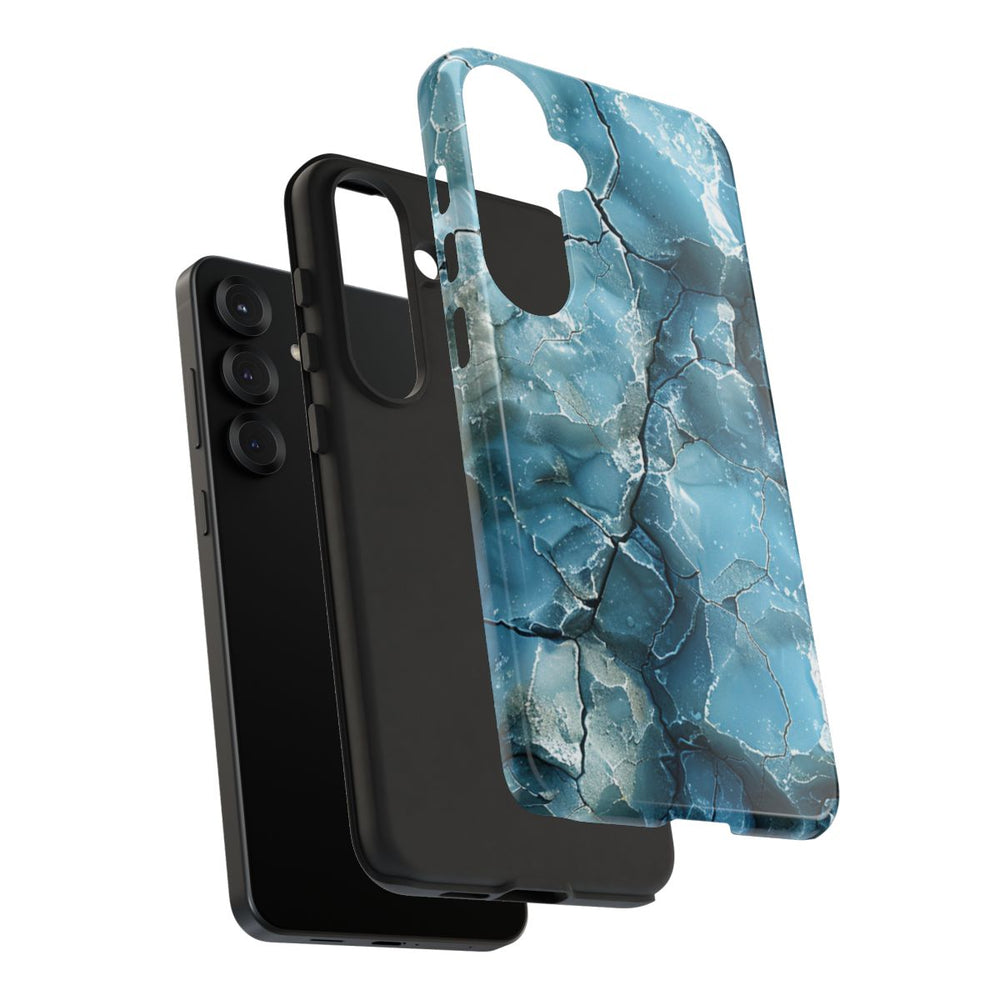 Dit ontwerp toont een naadloos fractalpatroon dat lijkt op gebarsten ijs met een stoere, getextureerde uitstraling. De afbeelding bestaat uit diverse blauwtinten, fijne barsten en subtiele witte accenten, wat zorgt voor een ruwe en natuurlijke ijzige look. Het licht komt van recht achter de camera, waardoor de structuur egaal wordt verlicht zonder schaduwen. Het patroon is bedrukt op een glanzend, stevig hoesje van polycarbonaat en TPU, dat bestaat uit twee beschermende lagen en geschikt is voor draadloos opladen.