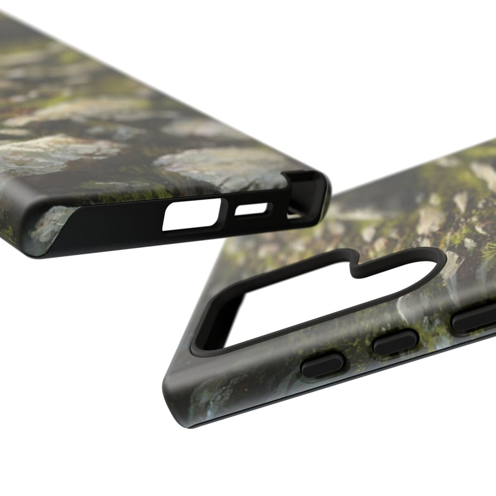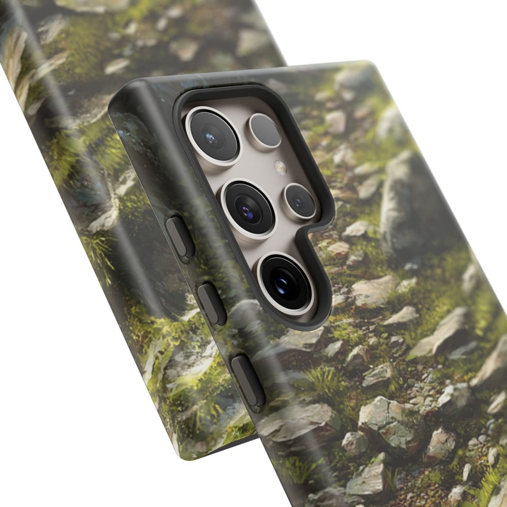 Dit telefoonhoesje is voorzien van een gedetailleerde illustratie van een rotsachtig pad, omgeven door grote stenen en groene begroeiing. Het pad is oneffen, met verspreide rotsen en gras dat tussen de stenen groeit. Natuurlijk licht accentueert de texturen van de stenen en planten. Het matte, stevige hoesje is gemaakt van polycarbonaat en TPU en biedt duurzame bescherming, ideaal voor gebruik buitenshuis.