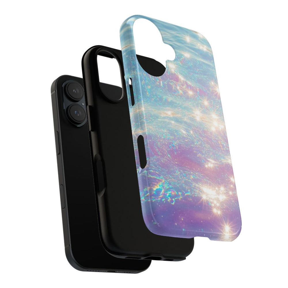 Dit hoesje heeft een betoverend ontwerp met een close-up van water, waarin schitterende lichtreflecties fonkelende sterretjes op het oppervlak creëren. Zachte golfjes en een iriserend effect geven het water subtiele pasteltinten van blauw, paars en een vleugje roze. Het geheel oogt glad en stralend en vangt de zachte beweging en glinsterende accenten van het water prachtig op. Het hoesje is glanzend afgewerkt en bestaat uit een stevige dubbele laag van polycarbonaat en TPU, voor optimale bescherming en ondersteuning van draadloos opladen.