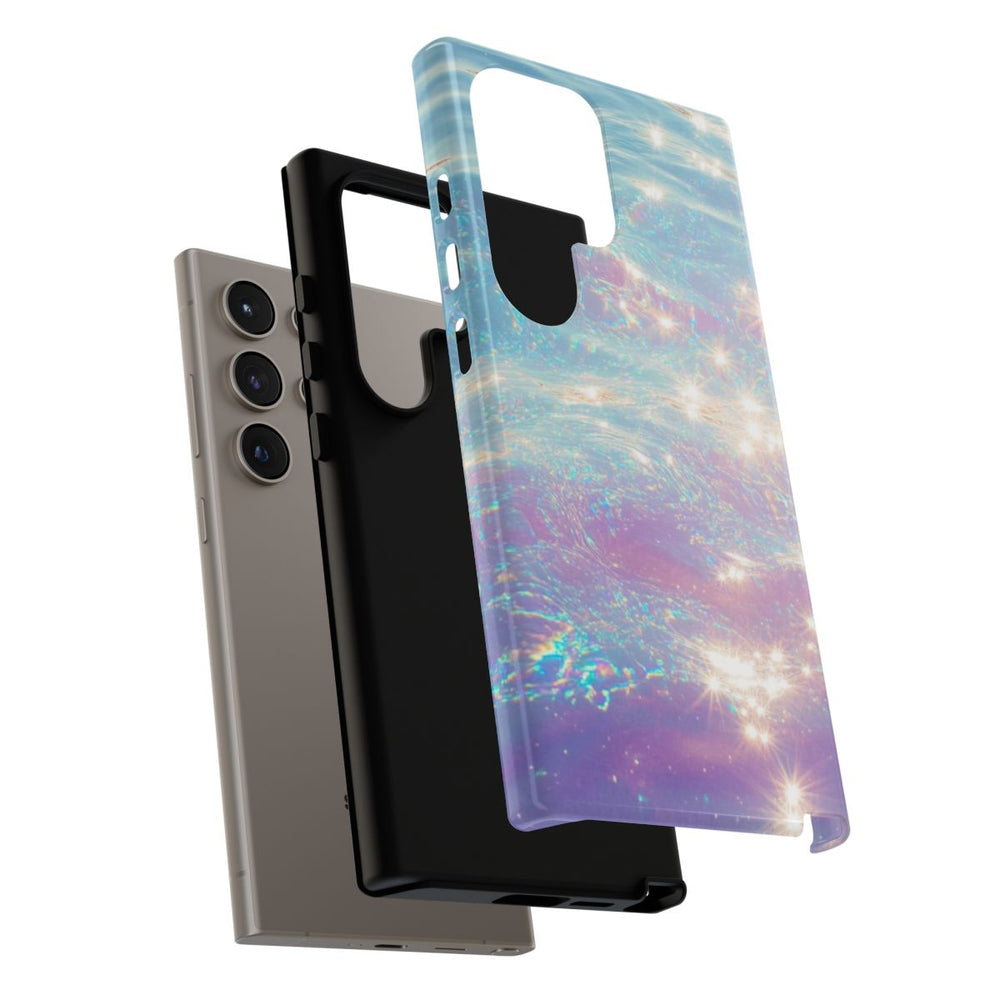 Dit hoesje heeft een betoverend ontwerp met een close-up van water, waarin schitterende lichtreflecties fonkelende sterretjes op het oppervlak creëren. Zachte golfjes en een iriserend effect geven het water subtiele pasteltinten van blauw, paars en een vleugje roze. Het geheel oogt glad en stralend en vangt de zachte beweging en glinsterende accenten van het water prachtig op. Het hoesje is glanzend afgewerkt en bestaat uit een stevige dubbele laag van polycarbonaat en TPU, voor optimale bescherming en ondersteuning van draadloos opladen.