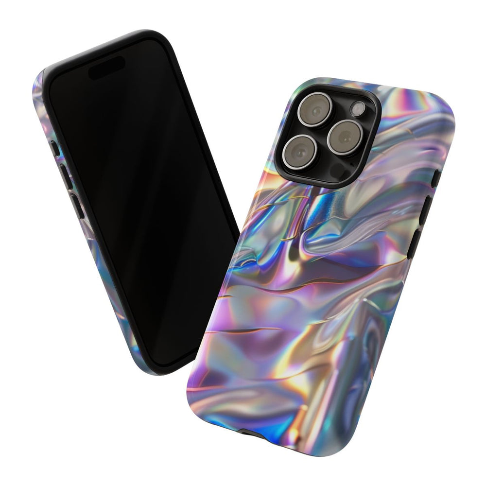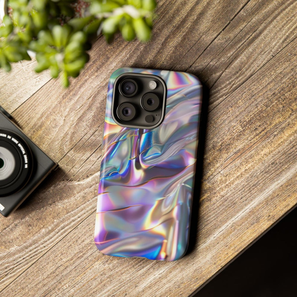 Dit ontwerp toont een close-up van een iridescerende, holografische textuur met een gladde, golvende uitstraling. De afbeelding laat een glanzend, reflecterend oppervlak zien met een regenboog aan kleuren zoals blauw, paars, roze en geel. Het glanzende, stevige hoesje heeft een dubbele laag van een polycarbonaat buitenkant en een TPU binnenzijde, wat zorgt voor extra stevigheid en bescherming. Het hoesje ondersteunt draadloos opladen en is bestand tegen weersinvloeden, terwijl de optische kwaliteit langdurig behouden blijft.