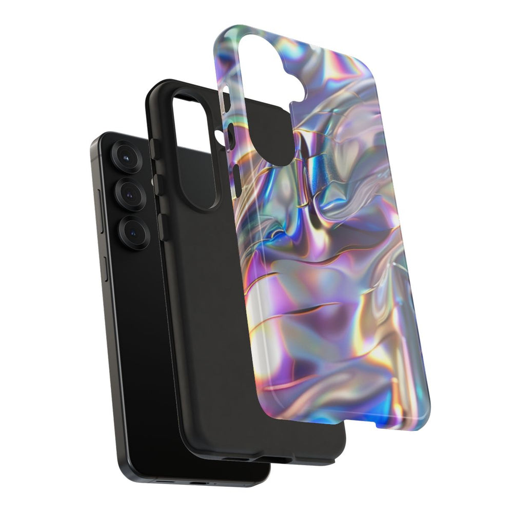 Dit ontwerp toont een close-up van een iridescerende, holografische textuur met een gladde, golvende uitstraling. De afbeelding laat een glanzend, reflecterend oppervlak zien met een regenboog aan kleuren zoals blauw, paars, roze en geel. Het glanzende, stevige hoesje heeft een dubbele laag van een polycarbonaat buitenkant en een TPU binnenzijde, wat zorgt voor extra stevigheid en bescherming. Het hoesje ondersteunt draadloos opladen en is bestand tegen weersinvloeden, terwijl de optische kwaliteit langdurig behouden blijft.