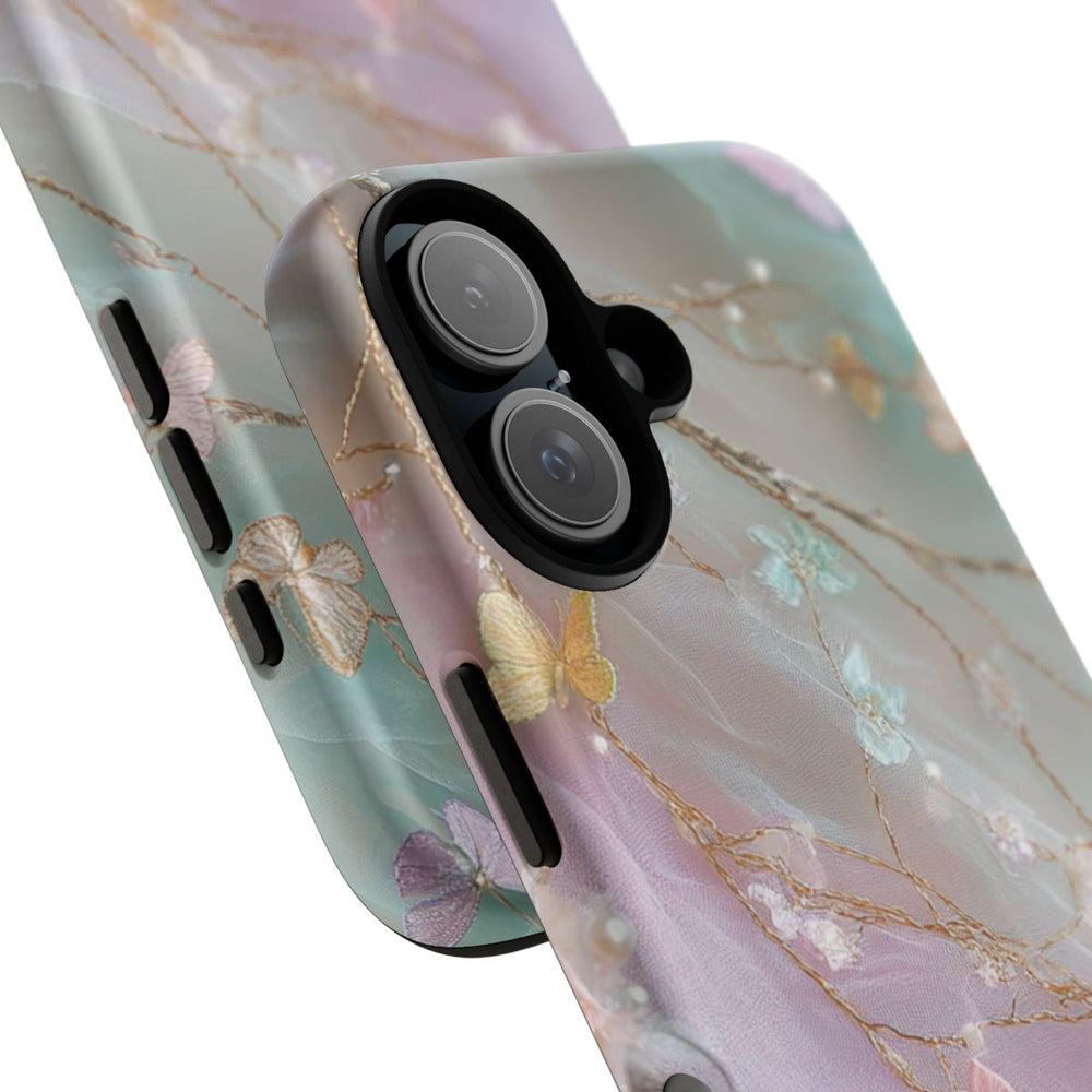 Dit hoesje heeft een verfijnd ontwerp met doorschijnende lagen stof in pasteltinten als lila, mint en zachtroze. Goudkleurig geborduurde rankjes slingeren over het oppervlak, versierd met kleine parelkralen en gedetailleerde vlinders in zachte pastelkleuren. Op de achtergrond is een witte berken tak te zien met goudkleurige uiteinden. Het matte hoesje bestaat uit twee lagen van polycarbonaat en TPU, ondersteunt draadloos opladen en biedt bescherming tegen weersinvloeden.