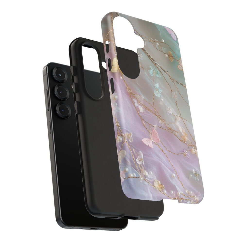 Dit hoesje heeft een ontwerp met doorschijnende stoffen lagen in pasteltinten zoals lavendel, mint en zachtroze. Fijne geborduurde slingerplanten met parelkralen en kleine bloemen kronkelen sierlijk over de stof. Verspreid over het geheel vind je vlinders in zachte kleuren zoals paars, roze, geel en blauw. Op de achtergrond is een witte berkentak te zien met goudkleurige uiteinden. Het hoesje bestaat uit twee stevige lagen van polycarbonaat en TPU, heeft een matte afwerking en is geschikt voor draadloos opladen. Niet geschikt voor MagSafe-accessoires.