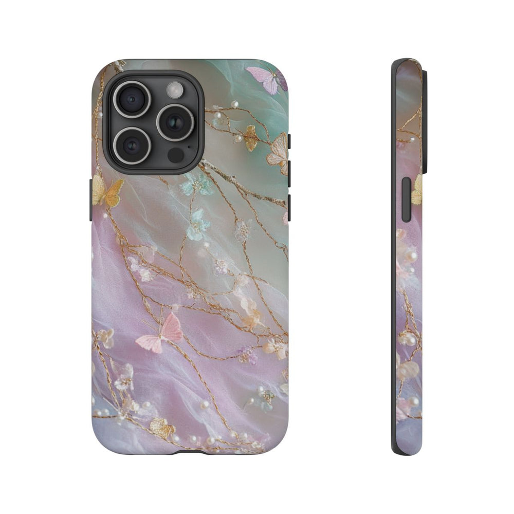 Dit hoesje heeft een ontwerp met doorschijnende stoflagen in pasteltinten zoals lavendel, mint en zachtroze. Fijne geborduurde ranken met parelkralen en kleine bloemen slingeren sierlijk over de achtergrond. Verspreid over het geheel zijn kleurrijke vlinders te zien in zachte tinten paars, roze, geel en blauw. Een witte berkentak met goudkleurige uiteinden zorgt voor een natuurlijke touch. Het hoesje is gemaakt van polycarbonaat en TPU, biedt dubbele bescherming en is geschikt voor draadloos opladen.