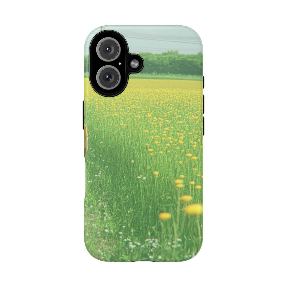 Op deze afbeelding staat een jongen op een smal pad, omringd door hoog, groen gras en kleine witte bloemen. De jongen draagt een geel shirt en een bruine broek. Voor hem ligt een uitgestrekt veld vol dichte, gele bloemen. Op de achtergrond zijn een rij bomen en elektriciteitspalen met draden te zien die de lucht doorkruisen. De scène is helder en vredig en straalt een natuurlijke, rustige sfeer uit. Dit matte, stevige telefoonhoesje heeft een dubbele laag voor extra duurzaamheid en bescherming.
