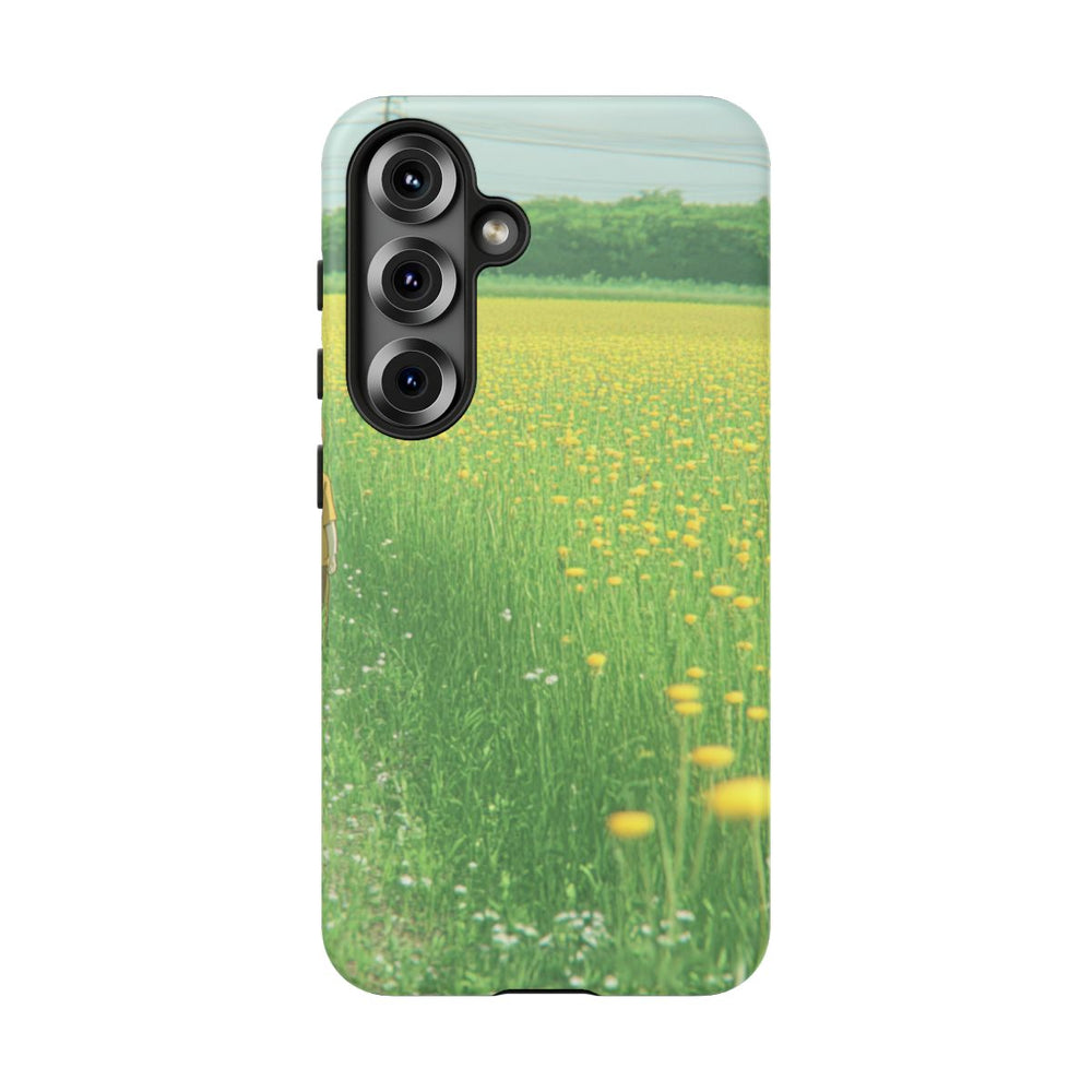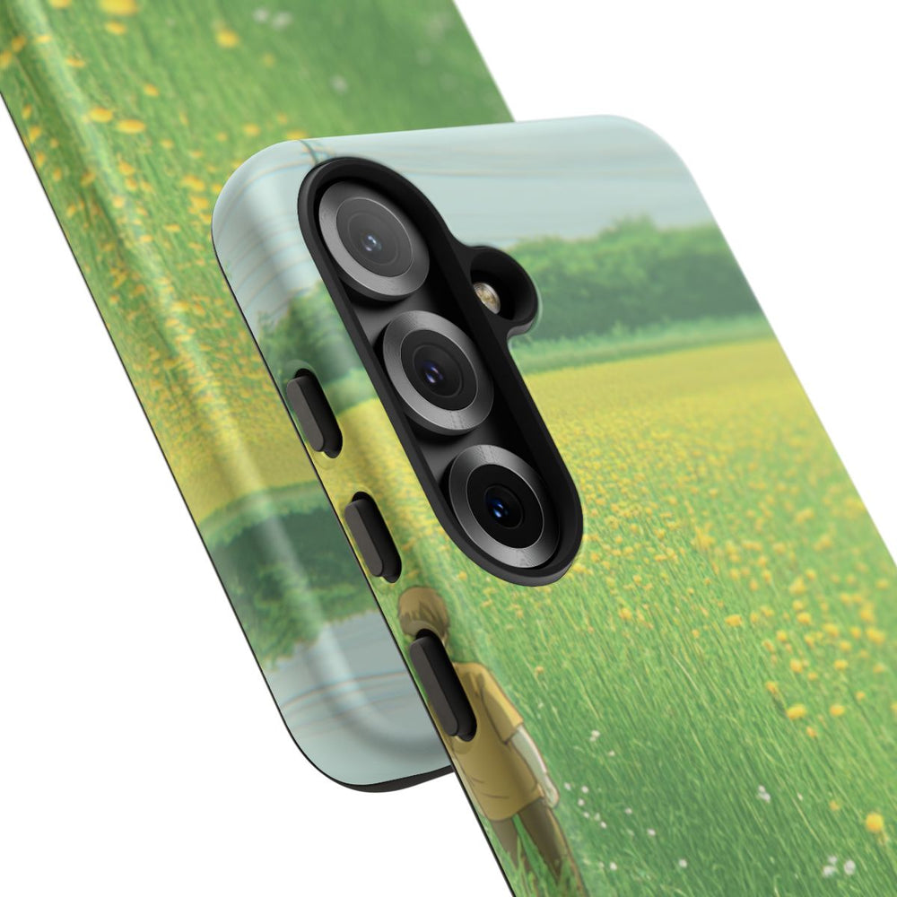 Op deze afbeelding staat een jongen op een smal pad, omringd door hoog, groen gras en kleine witte bloemen. De jongen draagt een geel shirt en een bruine broek. Voor hem ligt een uitgestrekt veld vol dichte, gele bloemen. Op de achtergrond zijn een rij bomen en elektriciteitspalen met draden te zien die de lucht doorkruisen. De scène is helder en vredig en straalt een natuurlijke, rustige sfeer uit. Dit matte, stevige telefoonhoesje heeft een dubbele laag voor extra duurzaamheid en bescherming.