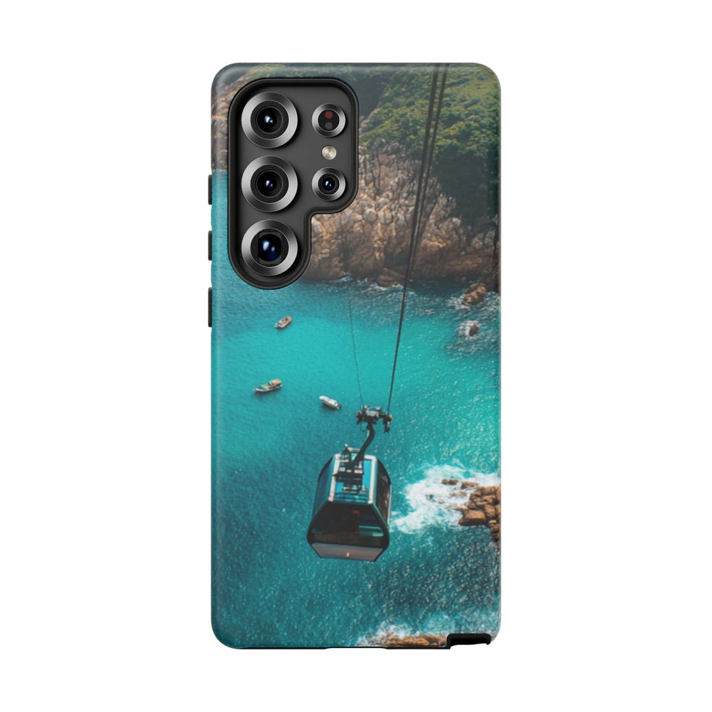 Dit hoesje toont een kabelbaan die hangt boven een levendige turquoise zee, waarin verschillende kleine bootjes dobberen. De kustlijn bestaat uit ruige rotskliffen en weelderig groene begroeiing. Het tafereel biedt een uitzicht vanaf grote hoogte, waarbij het contrast tussen het diepe blauw en turquoise water en de natuurlijke, rotsachtige oever duidelijk zichtbaar is. Dit stevige telefoonhoesje heeft een dubbele laag met een polycarbonaat buitenkant en een TPU-binnenzijde, wat zorgt voor extra bescherming en ondersteuning voor draadloos opladen.